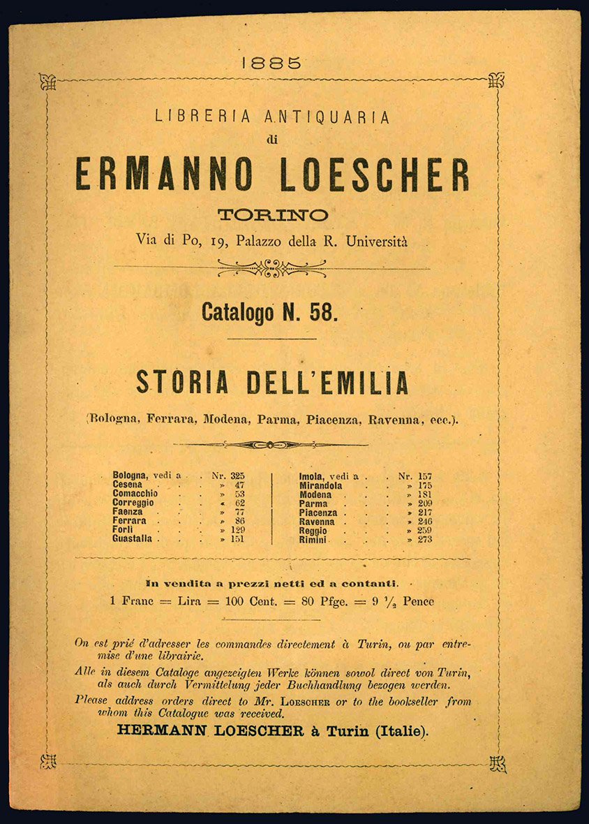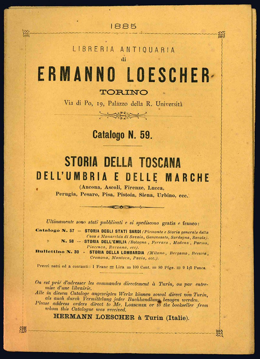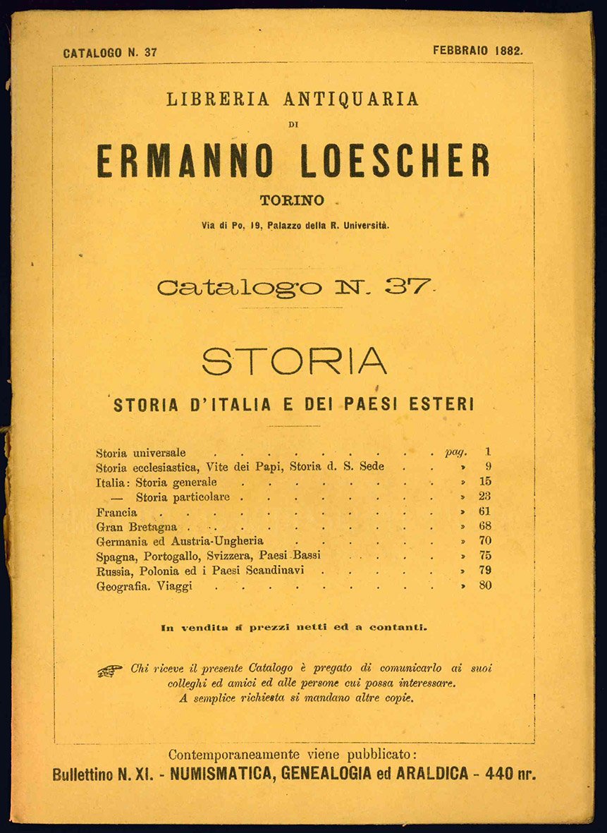 Nove cataloghi della "Libreria antiquaria di Ermanno Loescher" (n° 13, 23, 37, 58, 59, 62, 63, 64, 70), che vanno dal 1878 al 1886, insieme a "Bullettino periodico della libreria antica e moderna Ermanno Loescher" (n° 25 e 31) e "Storia universale. Scritti diversi storici opere originali".