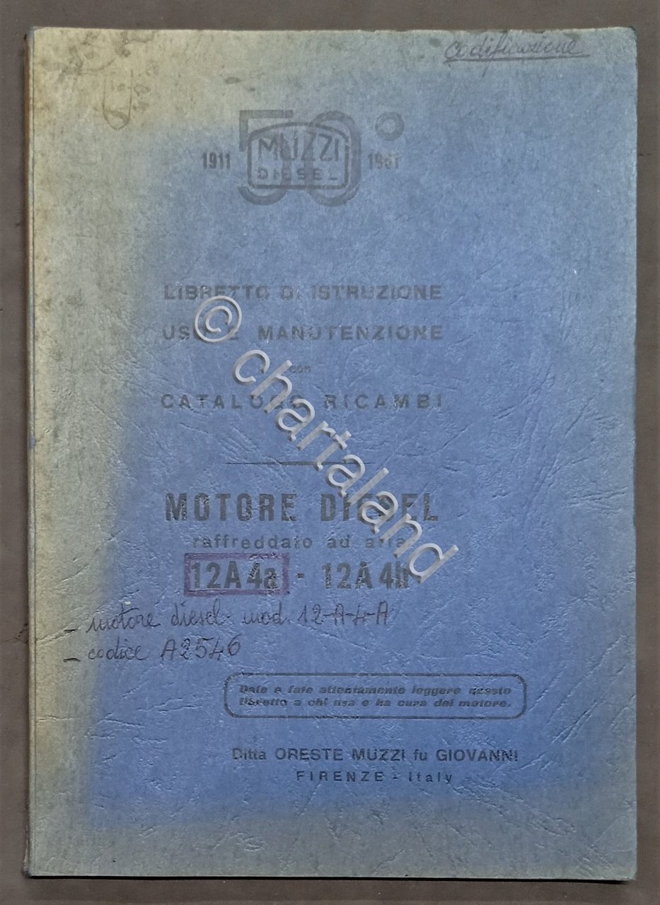 Libretto Uso e Manutenzione - Motore Diesel 12A 4a Muzzi - ed. 1961 Catalogo ricambi Testo in lingua italiana, Pag. 120 ca. Copertina morbida Condizioni molto buone