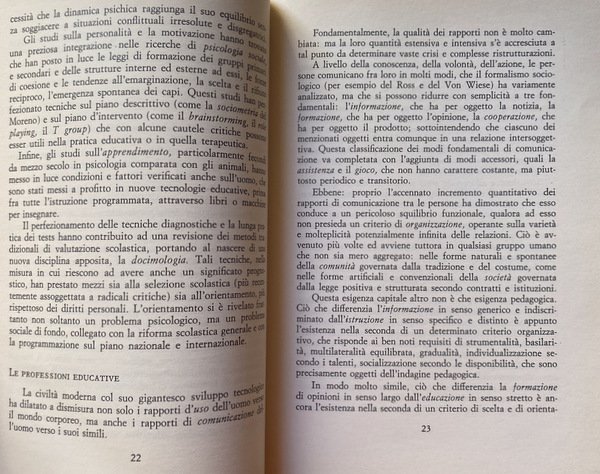 Soggetti: Pedagogia, Filosofia dell'educazione, Manuali, Classici, Riferimento, Bibliografia, Studi culturali, Guide pratiche, Insegnamento, Didattica, Concorsi, Esami, Docenti, Insegnanti, Scuola, Materie, Docenza, Scienze umane, Umanistica, Istruzione, Programmi scolastici, Testi scolastici, Correnti di pensiero, Pesniero pedagogico, Pedagogisti, Prove, Anni Settanta, Collezionismo, Libri Vintage Fuori catalogo, Teorie pedagogiche, Insegnare, Bambini, Alunni, Allievi, Studenti, Formazione permanente, Lineamenti, Sinossi storiche, Lessico pedagogico, Sussidi audiovisivi, Esercitazioni didattiche, Tirocinio magistrale, Programmazione, Elementari, Primaria, Medie, Superiori, Liceo, Cultura, Gioco, Informatica, Ragazzi, Computer, Schede, Georg Kerschensteiner, Tecnologia, Cronologia, Adolescenza, Sviluppo psichico, Apprendimento, Età evolutiva, Scienza, Condizionamento, psicologia, Ambiente sociale, Famiglia, Imitazione, Adulti, Antinomie dei fini, Mezzi, COmunicazione, Fruizione, Creatività, Giochi, Lavoro, Attività extrascolastiche, Eteronomia, Autonomia, Giudizio, Condotta, Sport, Educazione fisica, Civica, Etica, Religione, Cibernetica, Innovazione, Memoria, Affettività, Stimoli, Risposte, Obiettivi, Adattamento, Giocattoli, Tempo libero, Cicli, Gruppi, Classe, Classi differenziali, Riforme, Secondaria, Compagni, Amicizia, Consiglio, Punizione, Istituzioni, Uguaglianza, Distinzione, Linguaggio, Compiti, Tema, Vacanze, Analfabetismo, Descolarizzazione, Valutazione, Correzione, Reattivi Docimologici, Elaborazioni statistiche, Libro, Sussidiario, Diario, Registro, Biblioteca, Lavagna, Proiettori, Norme, Corsi di recupero, Immagini luminose, Film, Cinema, Libri usati come nuovi, Lezioni, Cartelloni, Mappamondo, Matematica, Italiano, Dettato, Lettura, Scrittura, Cattedra, Episcopio, Antichità, Modernità, Contemporanea, Infanzia, Jean Piaget, Maria Montessori, Aldo Agazzi, Jung, Freud, Binet, Caratterologia, Ribot, Heymans Le Senne, Isaacs, Claparède, Preyer, Gesell, Auxologia, Buhler, Fasi evolutive, Agosti, Maritain, Mounier, Harvey, Kant, Rousseau, Voltaire, Hume, Pestalozzi, Bruner, Propriocezione, Herbart, Locke, Spinoza, Foerster, Giuseppe Lombardo Radice, Dewey, Ritter, Humboldt, Metodo, Clausse, Weiler, Spranger, Cooperazione, Personalità, Idealismo, Fenomenologia, Positivismo, Illuminismo, Materialismo, Dialettica, Spiritualismo, Esistenzialismo, Chiesa, Stato, Pubblica, Scienze sociali, Sociologia, Italy, Italian culture, Pedagogy, Philosophy of education, Manuals, Classics, Reference, Bibliography, Cultural studies, Practical guides, Teaching, Didactics, Contests, Exams, Teachers, School, Subjects, Teaching, Human sciences, Humanities, Education, Programs, Texts, Currents of thought, Pedagogical Thought, Pedagogists, Tests, Seventies, Collecting, Out of print books, Pedagogical theories, Teaching, Children, Pupils, Students, Permanent training, Outlines, Historical synopses, Pedagogical lexicon, Audiovisual aids, Exercises Master's internship, Programming, Elementary, Primary, Middle, Higher, High school, Culture, Game, Informatics, Kids, Computer, Cards, Technology, History, Adolescence, Psychic development, Learning, Developmental age, Science, Conditioning, Psychology, Environment social, Family, Imitation, Adults, Antinomies of ends, Means, Communication, Fruition, Creativity, Games, Work, Extra-curricular activities heteronomy, Autonomy, Judgment, Conduct, Physical education, civics, Ethics, Religion, Cybernetics, Innovation, Memory, Affectivity, Stimuli, responses, goals, adaptation, Toys, Free time, Cycles, Groups, Differential classes, Reforms, Secondary, Companions, Friendship, Council, Punishment, Institutions, Equality, Distinction, Language, Tasks, Theme, Holidays, Illiteracy, Descolarization, Evaluation, Correction, Docimological Reactives, Statistical processing, Book, Subsidiary, Diary, Registry, Library, Blackboard, Projectors, Standards, Recovery courses, Bright images, Used books as new, Lessons, Billboards, Globe, Mathematics, Dictation, Reading, Writing, Chair, Episcope, Antiquity, Modernity, Contemporary, Childhood, Characterology, Evolutionary phases, Cooperation, Personality, Idealism, Phenomenology, Positivism, Enlightenment, Materialism, Dialectics, Spiritualism, Existentialism, Church, State, Public, Science social, Sociology