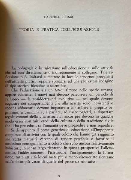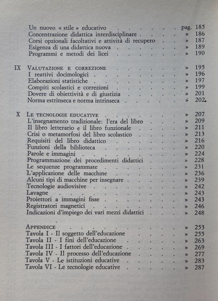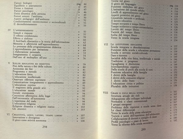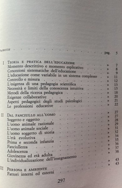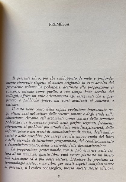 Il testo tiene conto della rapida evoluzione intervenuta negli ultimi anni nel settore delle scienze umane e degli studi sulla educazione. Accanto agli argomenti ormai classici della tematica pedagogica si troveranno perciò nelle pagine seguenti frequenti riferimenti ai problemi più attuali della interdisciplinarietà, della informazione e dei mezzi di comunicazione di massa, degli audio visivi e delle macchine per insegnare, del nuovo ruolo del libro e delle tecniche di istruzione programmata, del condizionamento e decondizionamento, della creatività, della descolarizzazione.
