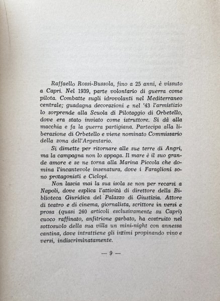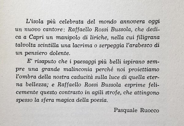 L'isola più celebrata del mondo annovera oggi un nuovo cantore: Raffaello Rossi Bussola, che dedica a Capri un manipolo di liriche, nella cui filigrana talvolta scintilla una lacrima o serpeggia l'arabesco di un pensiero dolente.