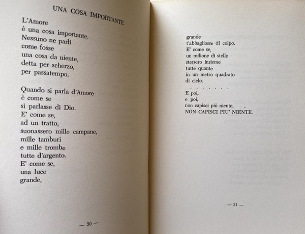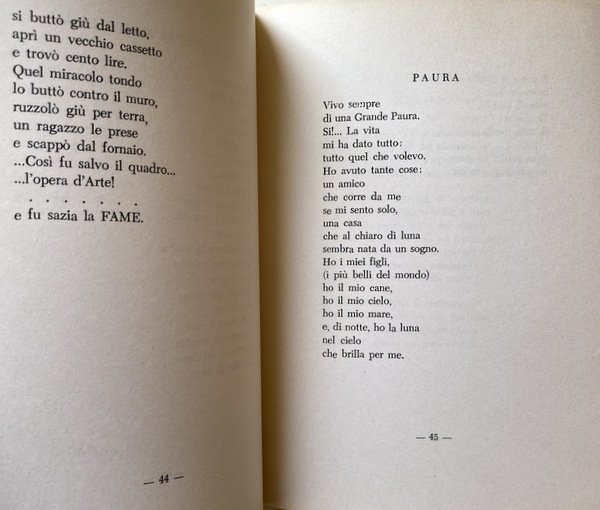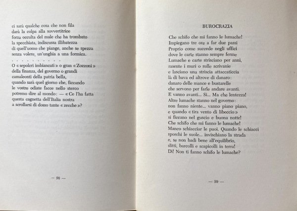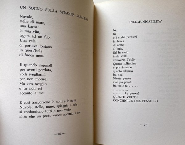 Soggetti: Poesia, Raccolte poetiche, Antologie, Liriche, Lirica, Poesie, Letteratura italiana, Capri, Scrittori capresi, Dialetto Napoletano, Versi, Canzoni, Amore, Collezionismo, Libri rari, Libri Vintage Fuori catalogo, Anni Settanta, Attori poeti napoletani, Marina Piccola, Faraglioni, Intellettuali, Coreani, Piazzetta, Cultura locale, Invettive, Curzio Malaparte, Monte Solaro, Scorci, Paesaggio, Burocrazia, Politica, Onorevole, Luna, Mauthausen, Incomunicabilità, Alma Siracusa-Vuotto, Grotta azzurra, Mare, Scoglio delle Sirene, Spiaggia saracena, Natale caprese, Da collezione, Rarità, Poetry, Poetic collections, Anthologies, Lyrics, Opera, Poems, Italian literature, Island, Capri writers, Neapolitan dialect, Verses, Songs, Love, Collecting, Rare books, Out of print books, Seventies, Neapolitan poet actors, Intellectuals, Koreans, Local culture, Invectives, Glimpses, Landscape, Bureaucracy, Politics, Honorable, Moon, Incommunicability, Blue grotto, Sea, Rock of the Sirens, Saracen beach, Christmas, Collectible, Rarity