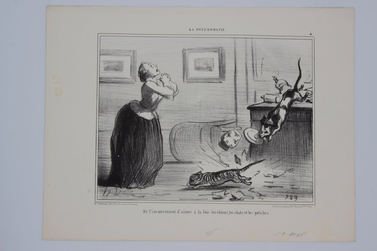 Lithographie originale en noir et blanc - La Potichomanie - De l'inconvénient d'aimer à la fois les chiens, les chats et les potiches.