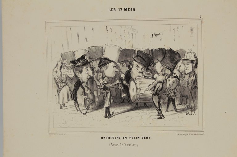 Lithographie originale en noir et blanc - Les 12 Mois - Orchestre en plein vent Mois de Février