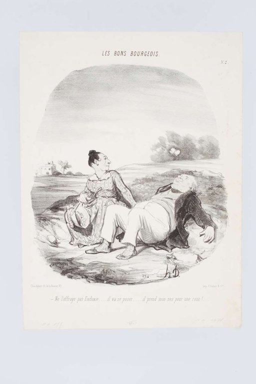 Lithographie originale en noir et blanc - Les Bons bourgeois - Ne l'effraye pas Eudoxie.il va se poser.il prend mon nez pour une rose !