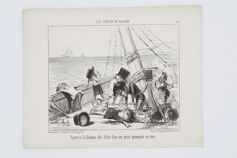 Lithographie originale en noir et blanc - Les trains de plaisir - Ayant eu la fâcheuse idée d'aller faire une petite promenade en mer.