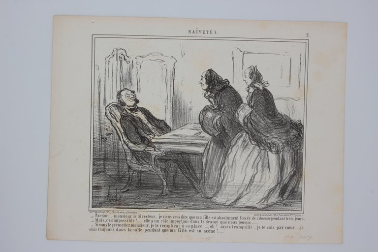 Lithographie originale en noir et blanc - Naïvetés - Pardon, monsieur le directeur, je viens vous dire que ma famille est absolument forcée de s'absenter pendant trois jours.