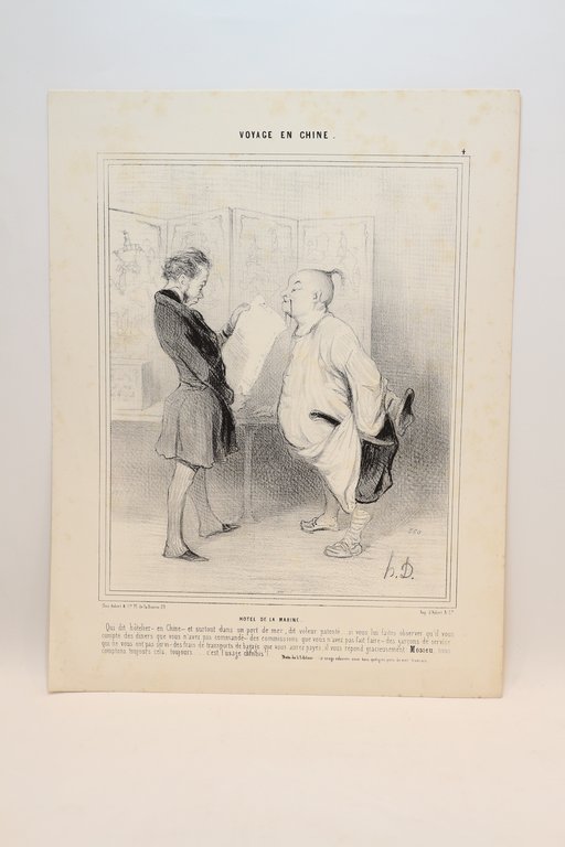 Lithographie originale en noir et blanc - Voyage en Chine - Hôtel de la Marine - Qui dit hôtelier - en Chine - et surtout dans un port de mer, dit voleur patenté.
