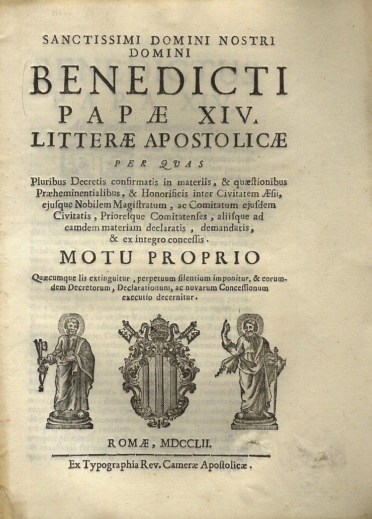 Litterae Apostolicae per quas Pluribus Decretis confirmatis in materiis, & quaestionibus Praeheminentialibus, & Honorificis inter Civitatem Aesii, ejusque Nobilem Magistratum, ac Comitatum ejusdem Civitatis, Prioresque Comitatenses, aliisque ad eamdem materiam declaratis, demandaris, & ex integro concessis. Motu proprio.