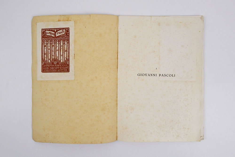 LIBROPrima edizione in parte originale.Dorso rinforzato, trascurabili fioriture, ma nel complesso bell’esemplare. Ex libris di Alfredo Toaff al contropiatto superiore.Antologia di scritti di Giovanni Pascoli a commemorazione della sua morte, stampata per iniziativa dei cittadini livornesi: raccoglie poesie in latino e italiano, uno stralcio dell’epistolario e alcuni articoli sul poeta firmati, tra gli altri, da Guido Mazzoni, Luigi Valli, Bianca Fleury Nencini, Irma Viggiani, Pietro Micheli. La realizzazione della plaquette si deve a Francesco Polese, che assembla un’ottima raccolta, ben curata anche dal punto di vista filologico; ma soprattutto, il merito di Polese è quello di riuscire a pubblicare non pochi componimenti inediti, stampando, di alcuni, anche il facsimile del manoscritto pascoliano: si veda, in particolare, quello dell’epigramma (in greco e latino) «Per la fiaschetteria del Nòccioli» dedicato a Carducci. Notevole la provenienza: Alfredo Sabato Toaff (Livorno, 1880-1963) è stato un importante rabbino e biblista.
