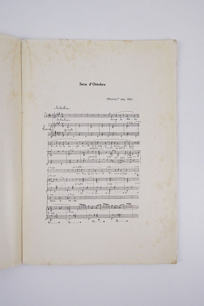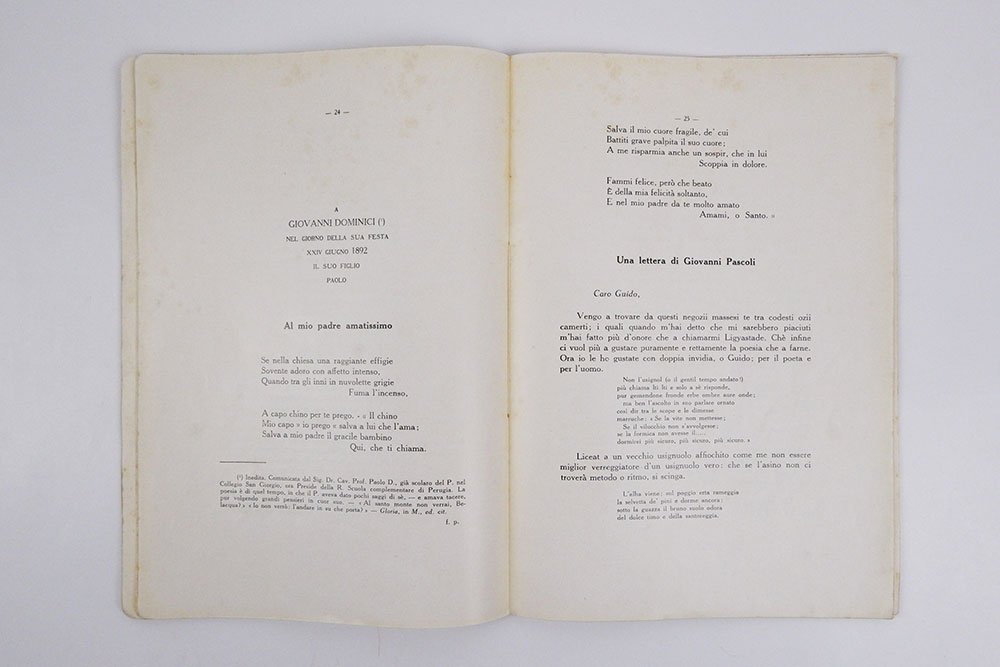 - brossura originale, al piatto superiore effige del poeta inserita in tondo tipografico, a quello inferiore «si vende a benefizio dell’“Istituto professionale e Casa di Riposo Giovanni Pascoli” (già ricovero di Mendicità)» e prezzo,
