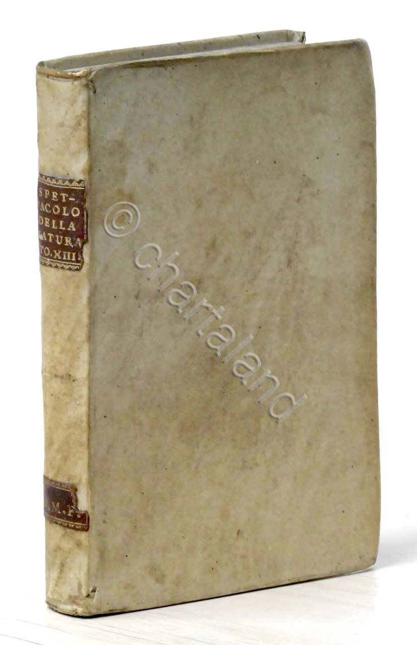 Lo spettacolo della natura ovvero trattenimenti sopra le particolarità della storia naturale... Opera tradotta dall'idioma francese in lingua toscana - 1751 Indice come da foto Tomo Decimoterzo che contiene in parte, cio che riguarda l'uomo in societàPag. [4], 342, [2] Legatura in pergamena - Testo in italiano. Buone condizioni generali.
