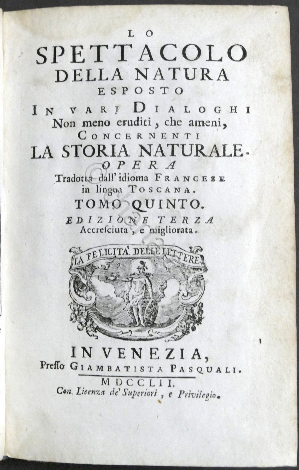 Lo spettacolo della natura esposto in varj dialoghi non meno eruditi, che ameni, concernenti la storia naturale. Opera tradotta dall'idioma francese in lingua toscana. Edizione terza accresciuta e migliorata - 1752 Indice come da foto Tomo Quinto - Pag. [4], 268 27 tavole calcografiche (una con circa metà mancante) compresa antiporta. Legatura in pergamena - Testo in italiano. Buone condizioni generali.