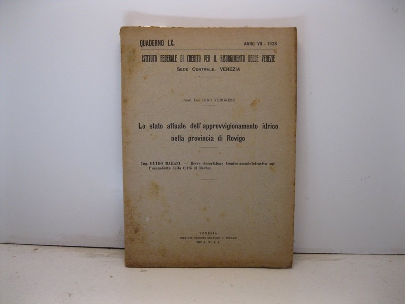 In 8, pp. XVI color rosa di dati dell'Istituto Federale di Credito per il Risorgimento delle Venezie + 87 + 14 di dati delle Banche Popolari delle Venezie con ill. n.t., 25 tavv. f.t. alcune su carta patinata con ill. e foto in b/n altre piu' volte rip. raff. 'Diagramma delle variazioni di produzione di alcune principali colture della Provincia di Rovigo'; 'Planimetria degli acquedotti e pozzi tubolari esistenti nella Provincia di Rovigo'; etc. Saggio sull'approvvigionamento idrico e sull'acquedotto comunale di Rovigo.