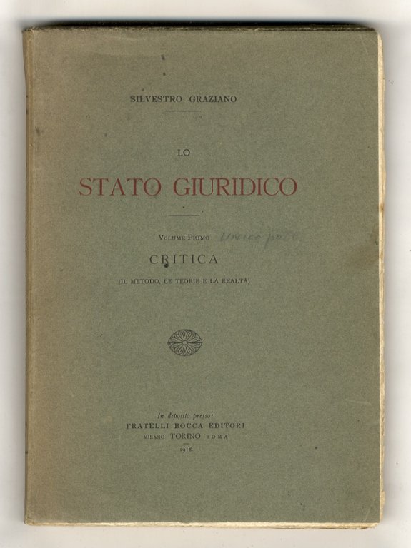 Lo stato giuridico. Volume primo: Critica. (Il metodo, le teorie e la realtà). [Unico volume pubblicato].