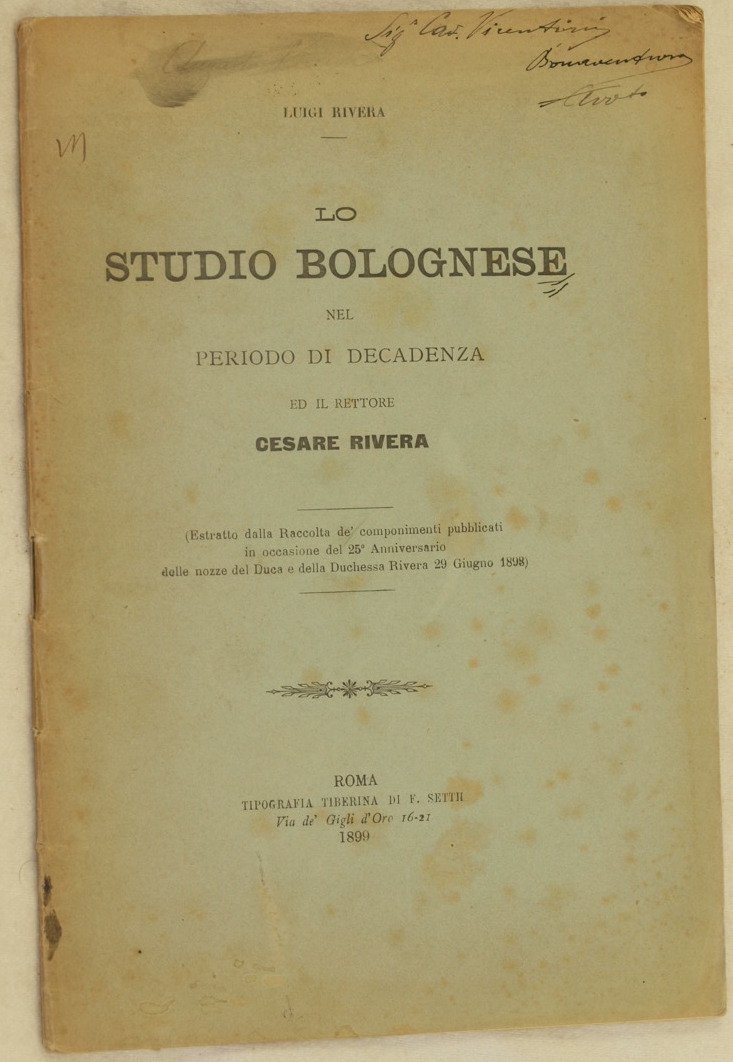 In 8. Dim. 24,5x16,5 cm. Pp. 34. Interessante pubblicazione del 1899 sullo "Studio bolognese" durante il periodo di decadenza e il rettore Cesare Rivera scritto da Luigi Rivera. Estratto dalla Raccolta de componimenti pubblicati in occasione del 25° Anniversario delle Nozze del Duca e della Duchessa Rivera 29 giugno 1898. Firma e note manoscritte in copertina. In buone condizioni Copertina editoriale in buone condizioni generali con lievi usure ai margini e dorso. Legatura in buone condizioni. All'interno le pagine si presentano in buone condizioni con rare fioriture. Interesting pamphlet of 1899 about the "Studio bolognese" during the period of DEcadence and Cesare Rivera written by Luigi Rivera Extract from Raccolta de componimenti pubblicati in occasione del 25° Anniversario delle Nozze del Duca e della Duchessa Rivera 29 giugno 1898 Handwritten signature and notes in the cover. In good conditions. Editorial in good general conditions slightly worn in the edges and spine. Binding in good conditions. Inside pages are in good conditions with occasional foxings.
