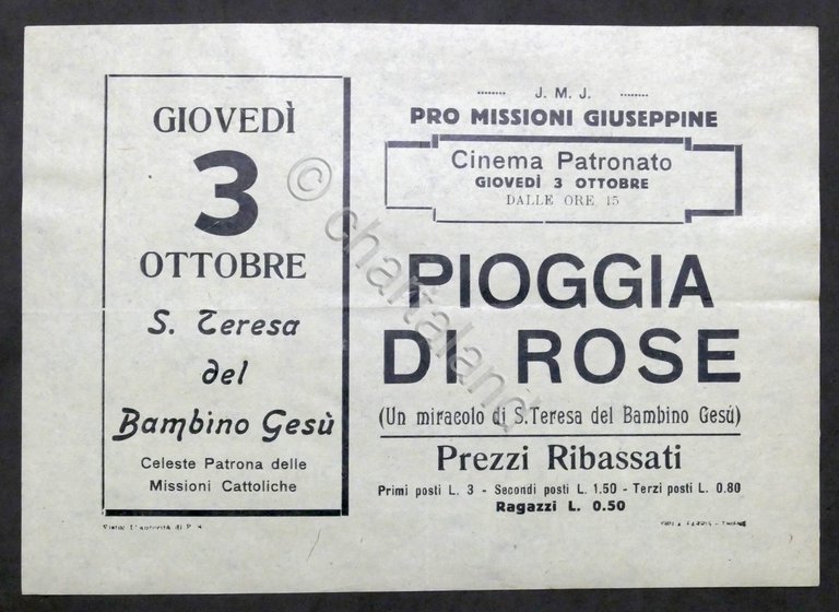 Locandina Cinema Patronato di Thiene - Pioggia di Rose - anni '30