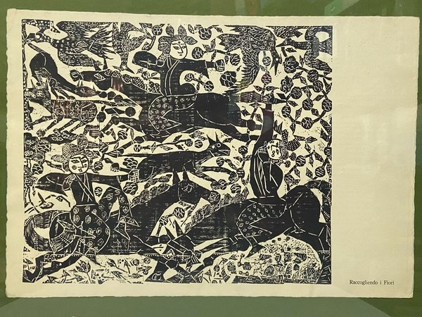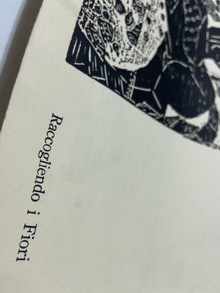 Locandina descrittiva raffigurante L'opera Raccogliendo i Fiori stampata. Sul retro cenni sulla vita e le opere dell'Artista, 52x36 cm circa