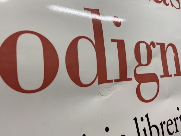 80x147 cm circa, plastificata opaca. Piega centrale, segnatura sotto la lettera "d" e lievemente sbiadito.