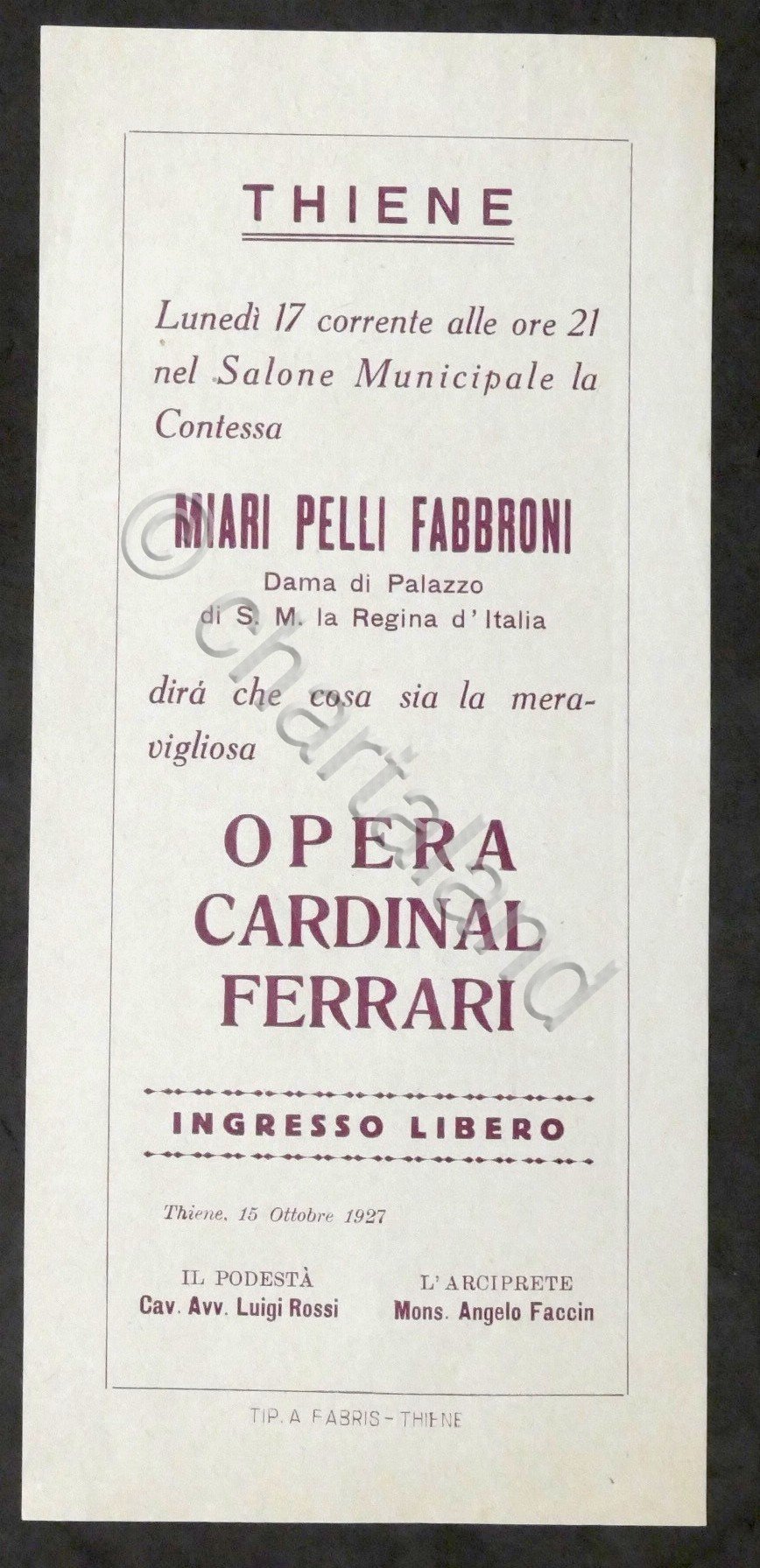 Locandina Salone Municipale di Thiene - La Contessa Miari Pelli Fabbroni dir&agrave, che cos sia la meravigliosa Opera Cardinal Ferrari - 1927