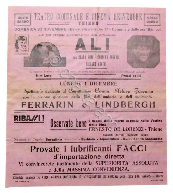 Locandina Teatro Comunale e Cinema Belvedere di Thiene - Film di guerra: Ali con Clara Bow e Charles Rogers - Film: Ferrarin e Lindbergh - 1928 ca.
