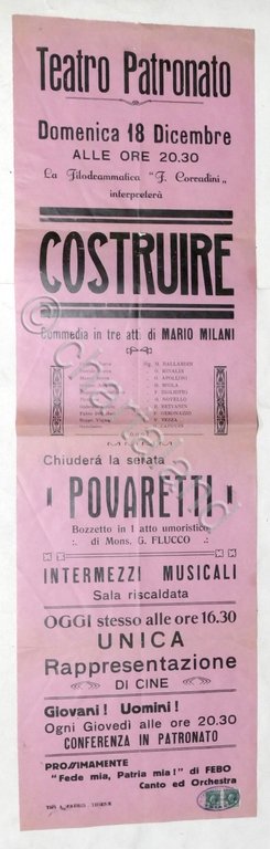 Locandina Teatro Patronato di Thiene - Commedia in 3 atti: Costruire - Bozzetto in 1 atto umoristico: Povaretti - 1930 ca.