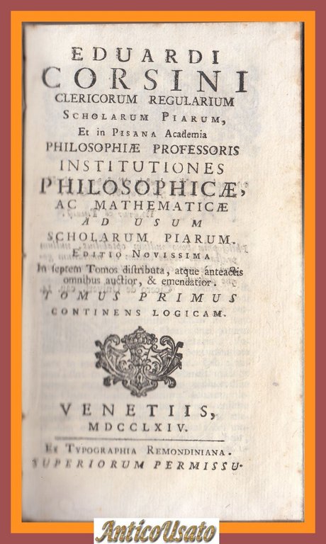 LOGICAM di Edoardo Corsini volume 1 INSTITUTIONES PHILOSOPHICAE 1764 libro antic