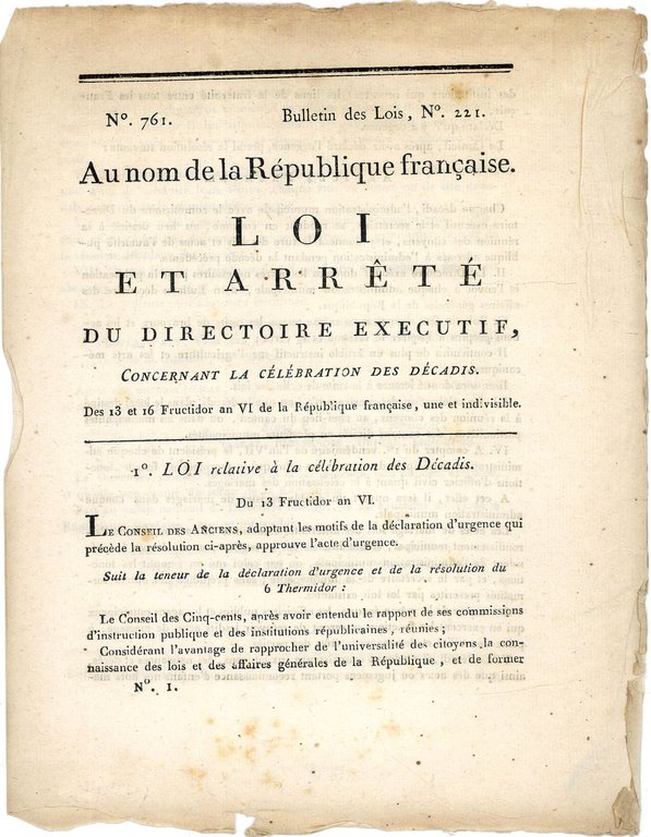 4 pages. (28x21 Cm). Broché. Petits accrocs. Rousseurs. Ce texte contient diverses dispositions prises par le Conseil des Cinq-cents concernant la célébration des "Décadis". Le "décadi" était le dixième et dernier jour de la décade, jour chômé qui remplaçait le dimanche chrétien. Sa célébration réunissait les citoyens, avec l'administration municipale, les professeurs et élèves des écoles publiques ou "particulières", etc. On y procédait à des "jeux et exercices gymniques", à la lecture de traits et actions propres à inspirer "le civisme et la vertu", etc.