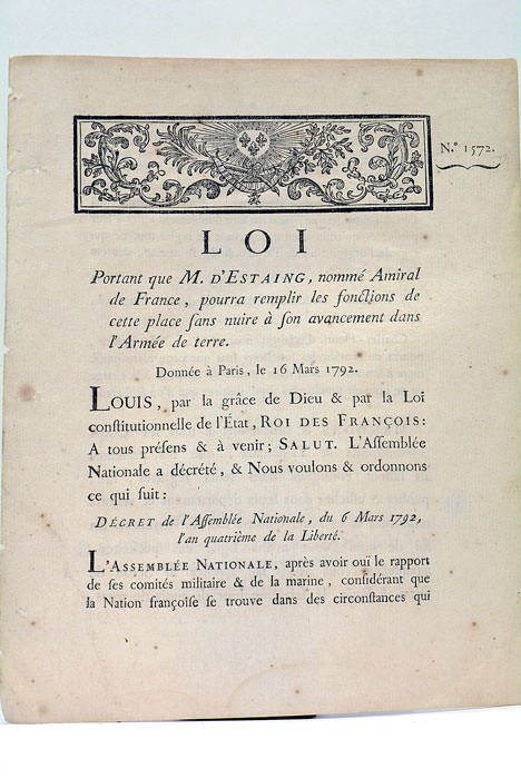 LOI portant que M. d'Estaing, nommé Amiral de France, pourra remplir les fonctions de cette place sans nuire à son avancement dans l'Armée de terre.