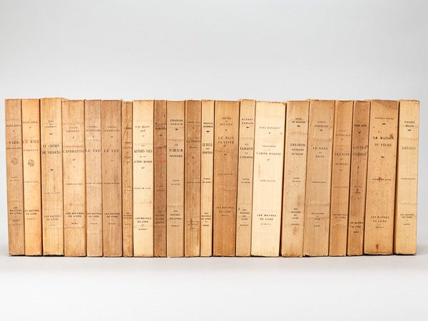 Exemplaires sur papier de Rives numérotés, 21 vol. petit in-8 br. sous couv. rempliée, collection Les Maîtres du Livre, George Crès et Cie : Vies imaginaires, 1921 ; Le Roi au Masque d'Or, 1917 ; Le Chemin de Velours, 1923 ; L'Apprentie, 1920 ; Le Feu (2 Tomes - Complet), 1919 ; Au flanc du Vase, 1919 ; Au Jardin de l'Infante, 1924 ; Physiologie de l'Amour Moderne, 1917 ; Les autres vies et les autres mondes, 1924 ; Colette Baudoche, 1918 ; Le coeur solitaire, 1922 ; La porte étroite, 1920 ; Le Deuil des Primevères, 1920 ; Le Bon Plaisir, 1918 ; Les Jeux rustiques et divins, 1925 ; Le Sang des Races, 1921 ; Le Trésor des Humbles, 1921 ; Contes choisis, 1919 ; La Maison du Péché, 1913 ; Barnavaux, 1921 Intéressante réunion de 21 volumes sur beau papier vélin de la belle collection "Les Maîtres du Livre" (qq. dos brunis ou lég. frottés, rares rouss., très bon état par ailleurs).