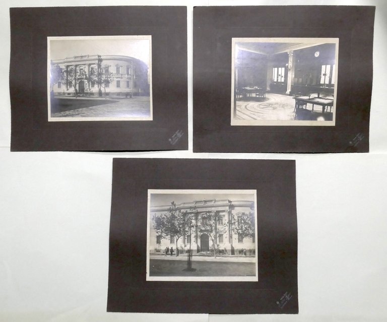 Lotto 3 fotografie di grandi dimensioni che riproducono il Palazzo della Banca Commerciale Italiana a Messina. Due fotografie mostrano la facciata dell'edificio mentre la terza riproduce un salone interno . anni '20 Le foto sono state realizzate dallo studio fotografico del Cav. Pedru Mauro. Il timbro del fotografo impresso ad inchiostro bianco è localizzato all'angolo inferiore destro del supporto in cartoncino semirigido. Dimensioni: foto 25 x 31 cm ca. / Supporto 43 x 53 cm ca. cad. Condizioni generali molto buone.
