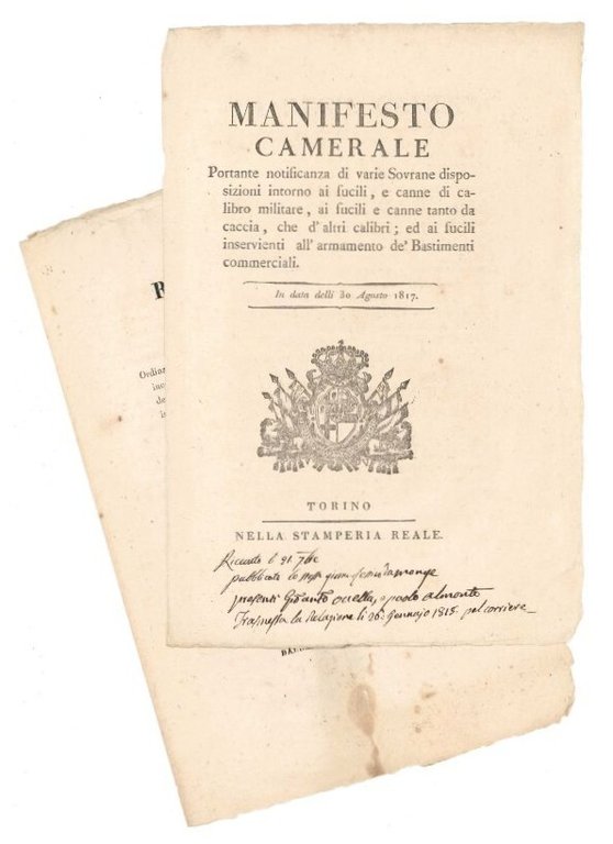 Due bifoli (mm. 312x208). Stemma regio impresso in legno alla prima pagina. Note manoscritte marginali ai frontespizi. Lievi macchie, ma ben conservati.