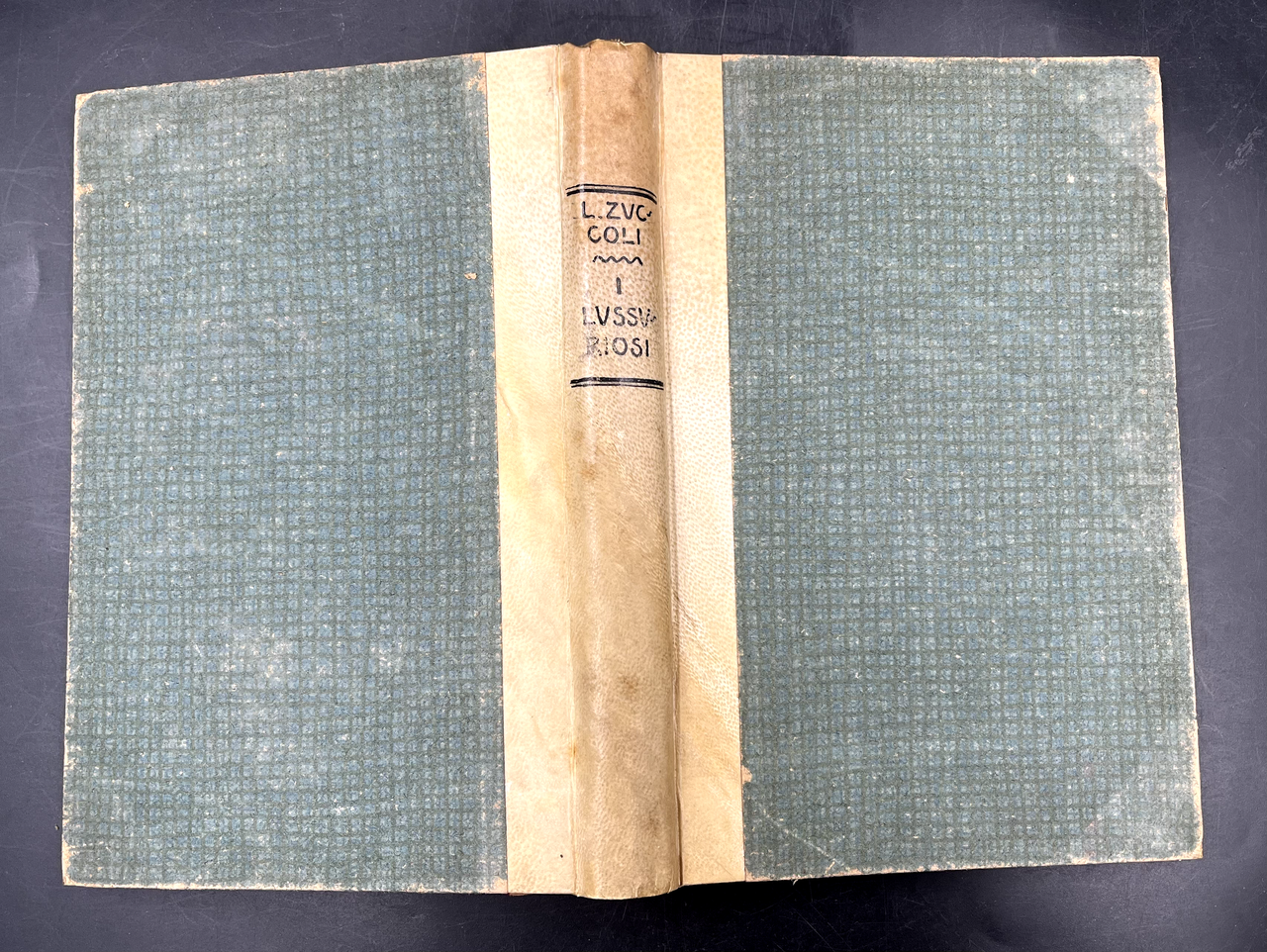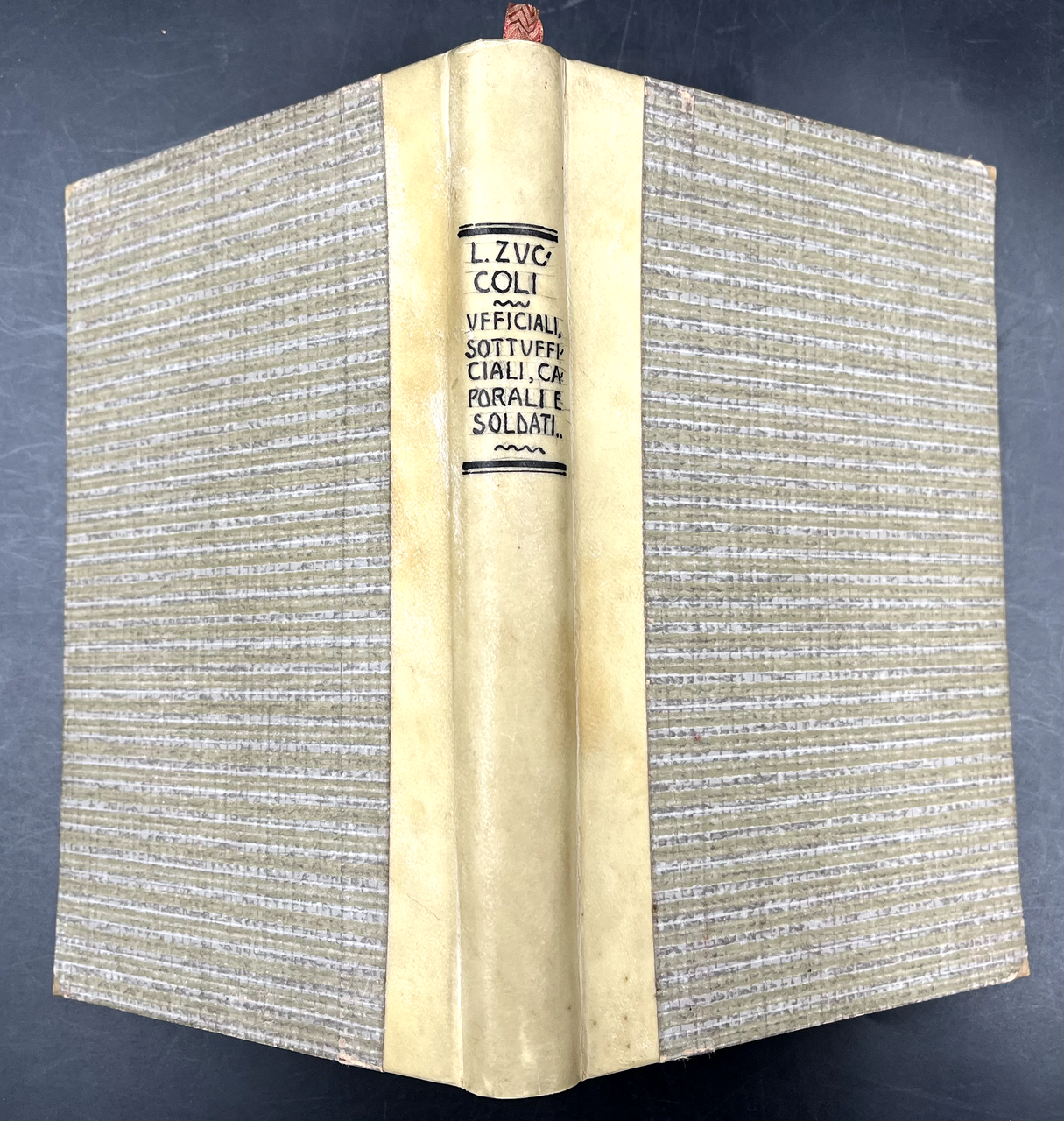 3 bei volumi in-16° (cm. 18,5) in insolite sobrie LEGATURE coeve da amatore in mezza pergamena e angoletti, titoli e fregetti irreprensibilmente tracciati a china ai dorsi, tagli rossi, nastrini segnalibro, ogni vol. un diverso tipo di raffinata carta decorata 1) I LUSSURIOSI. Terzo migliaio, 1913 (era uscito nel 1893), pp.266, (10). 2) UFFICIALI, SOTTUFFICIALI, CAPORALI, SOLDATI. Nuova edizione. 1910 (era uscito nel 1902). Pp. 3) IL DESIGNATO. 1910 (era uscito nel 1894). pp.XII, 292. zuccoli, autodefinitosi "riottoso e prepotente, bevitore e libertino, beffardo e cinico", esponente di successo della letteratura di consumo della Belle Epoque, sull'intrigo d'amore e sulla donna. Ogni volume 15. Il lotto di 3 belle legature