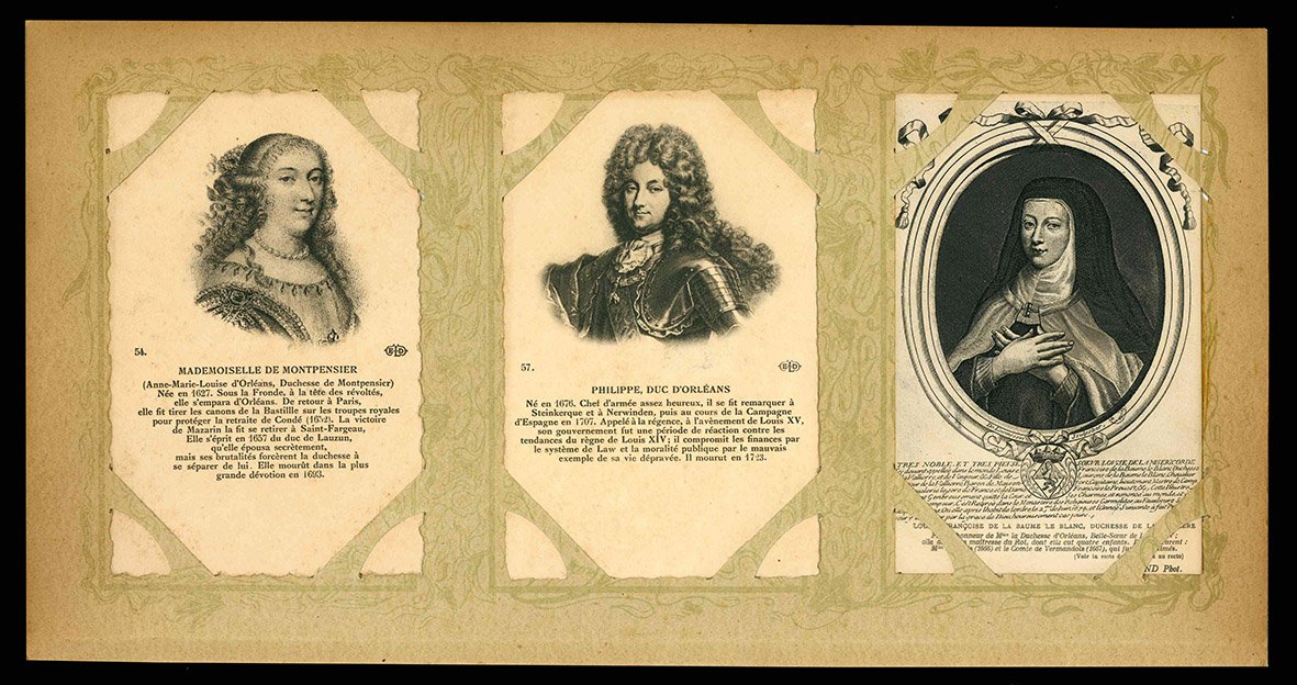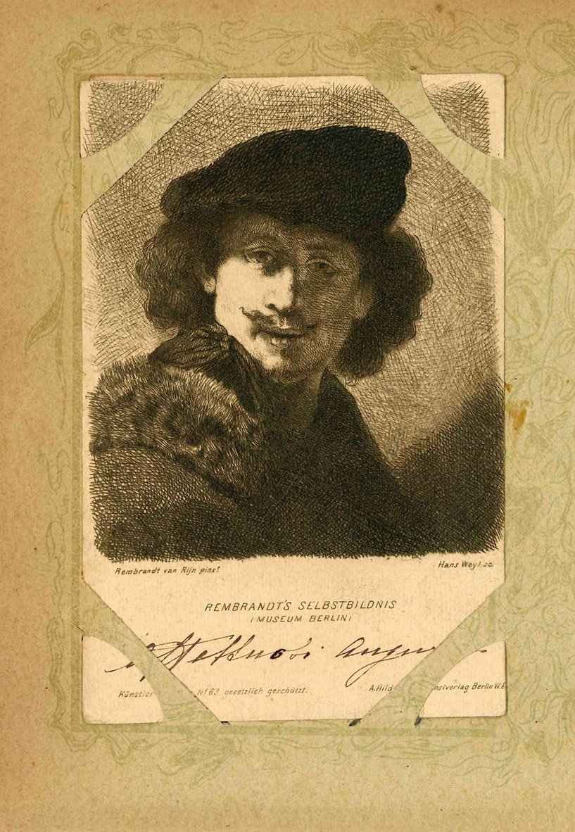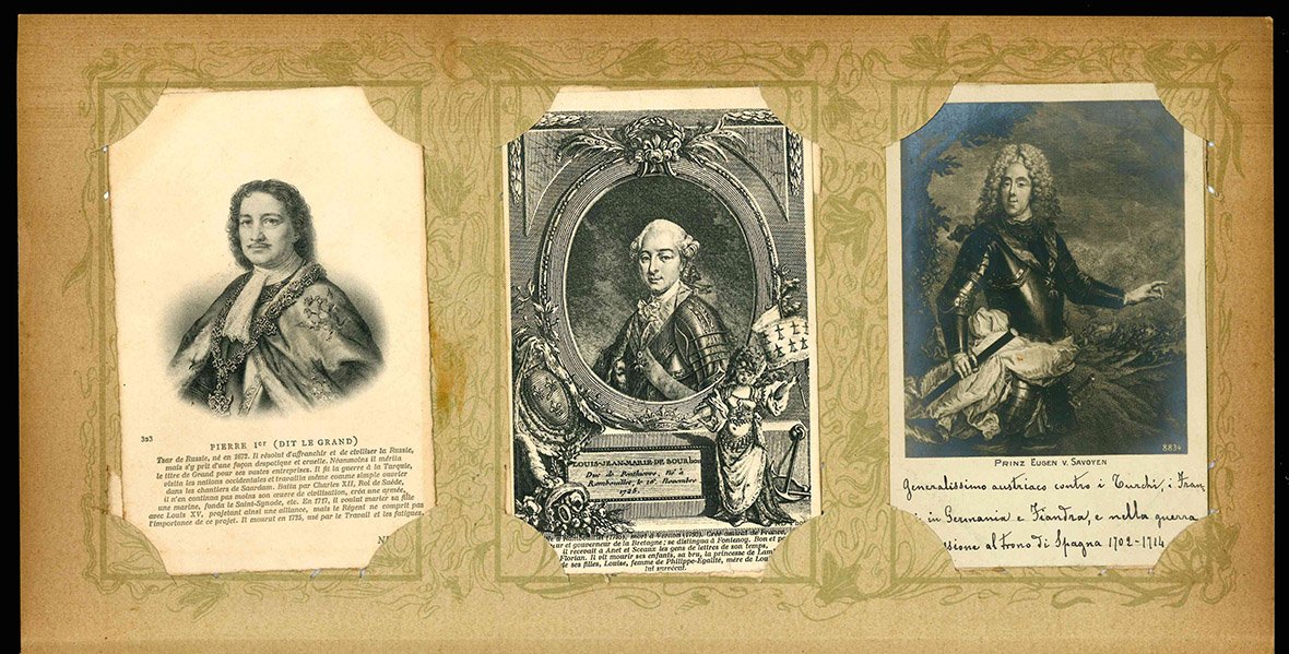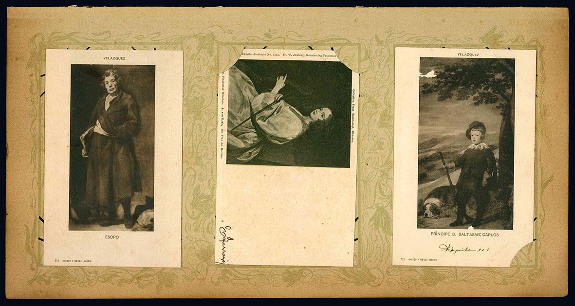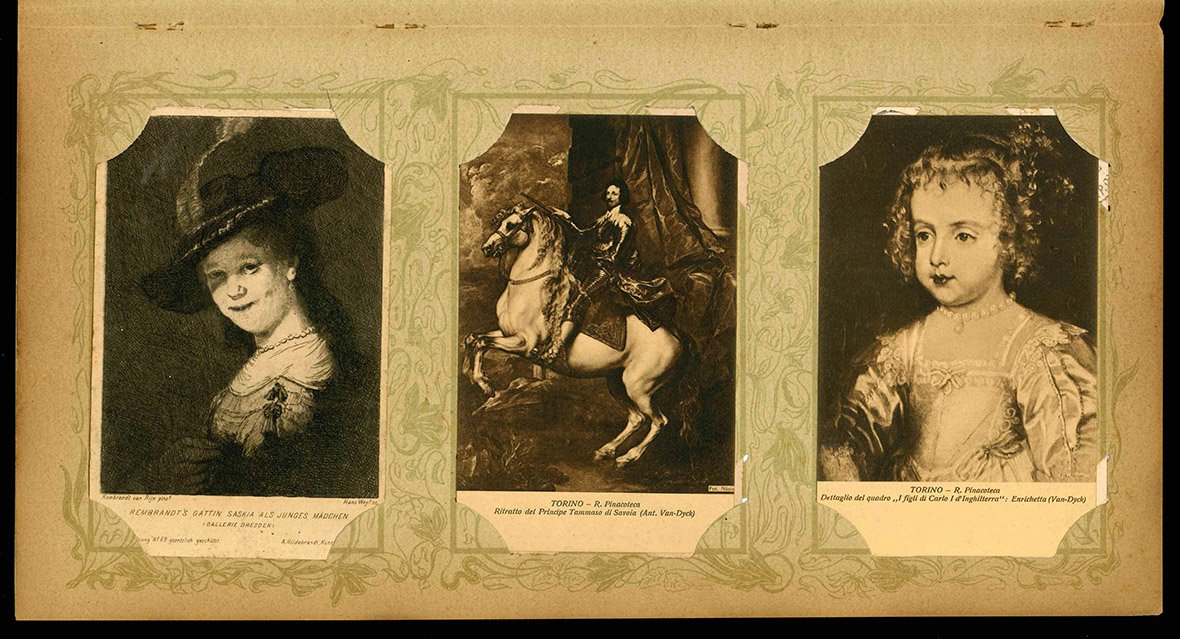 Lotto di 33 cartoline (mm 139x90 ca.) raffiguranti personaggi illustri ritratti da pittori famosi tra i quali Velazquez, A. van Dyck e Rembrandt. Le cartoline sono conservate all'interno di graziosi portacartoline in cartone decorato, che presentano bruniture marginali. Quattro cartoline sono viaggiate e presentano un timbro ("Hotel Central Bagni. 6 Lug. 1902 Salsomaggiore"), alcune cartoline risultano invece incollate al portacartoline. Minime mancanze ad alcune cartoline.