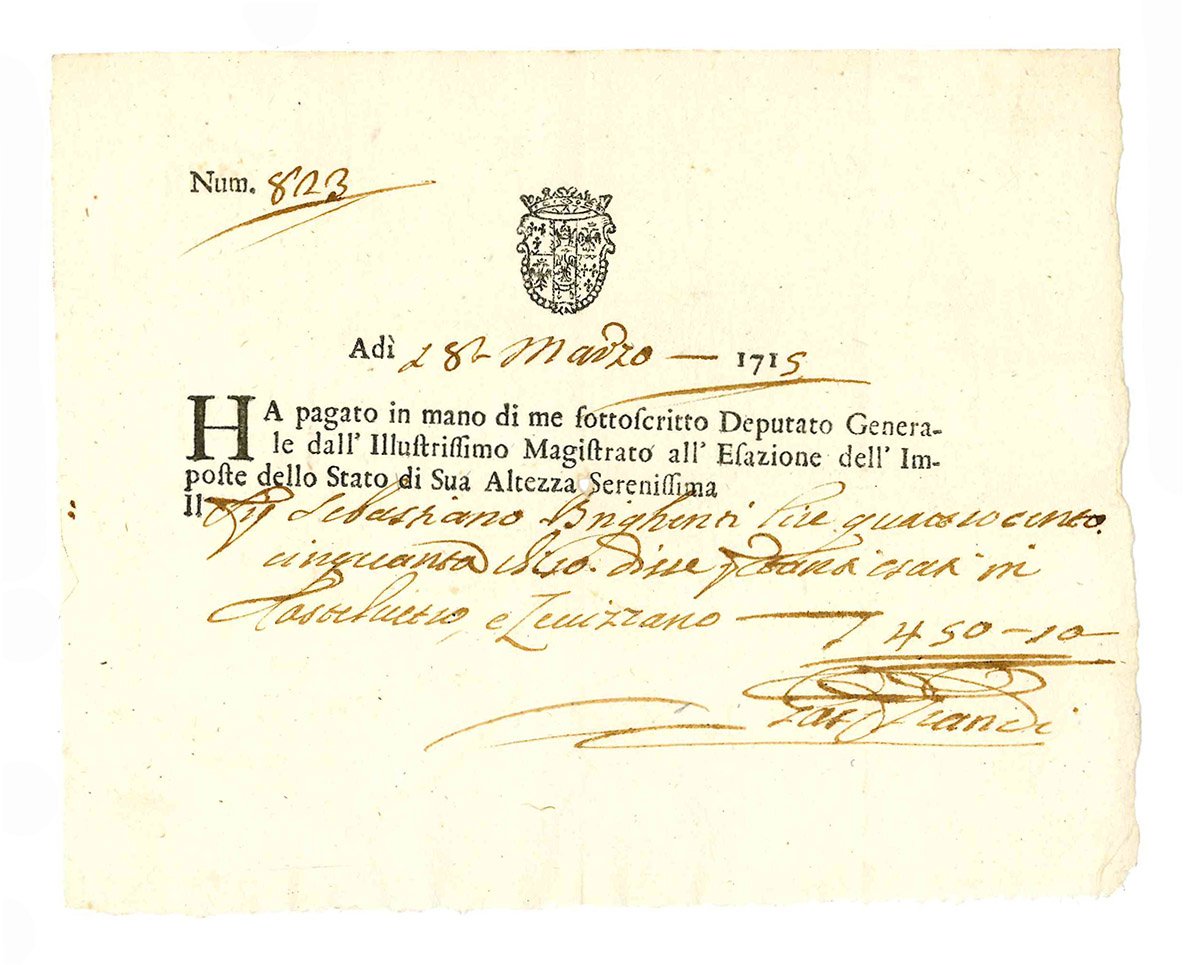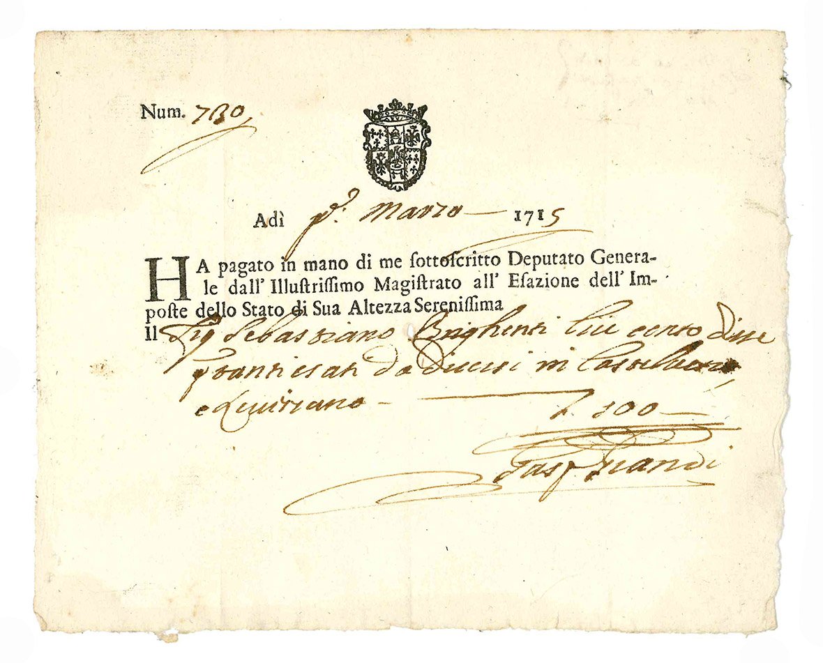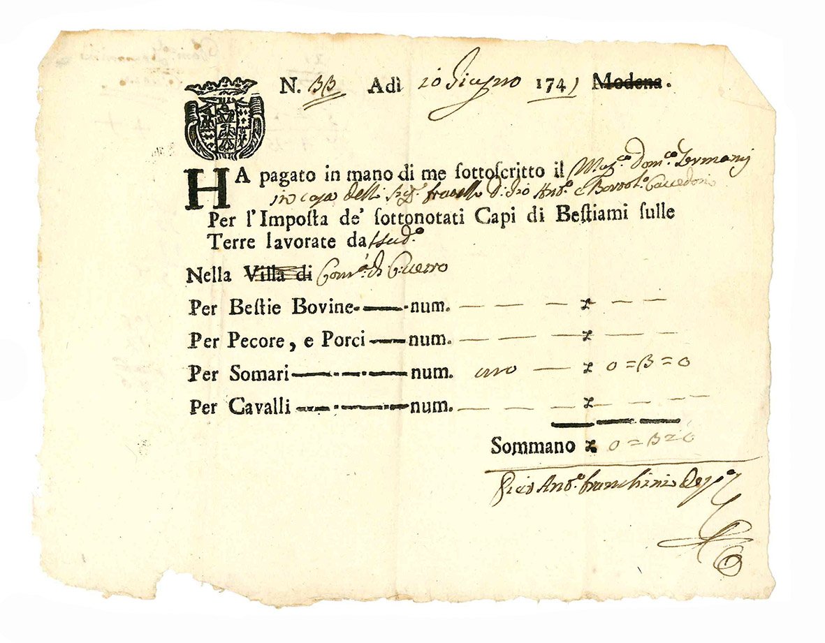 Interessante lotto di 59 ricevute di pagamento relative ai territori estensi. Fogli volanti a stampa, con spazi lasciati bianchi, compilati in forma manoscritta (mm 150x200 ca). Stemma estense impresso in legno al margine superiore di gran parte delle ricevute. Bianco il verso. Qualche macchia e lievi fioriture. Tracce di piegatura.