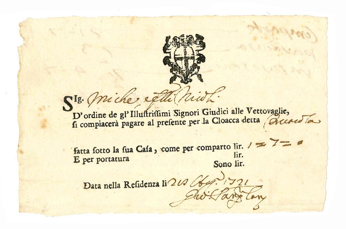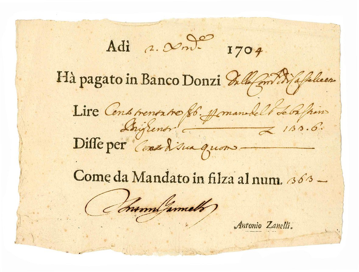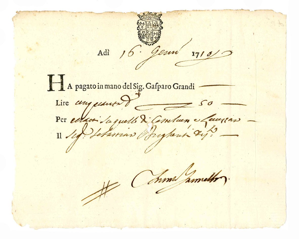 Interessante lotto di 59 ricevute di pagamento relative ai territori estensi. Fogli volanti a stampa, con spazi lasciati bianchi, compilati in forma manoscritta (mm 150x200 ca). Stemma estense impresso in legno al margine superiore di gran parte delle ricevute. Bianco il verso. Qualche macchia e lievi fioriture. Tracce di piegatura.