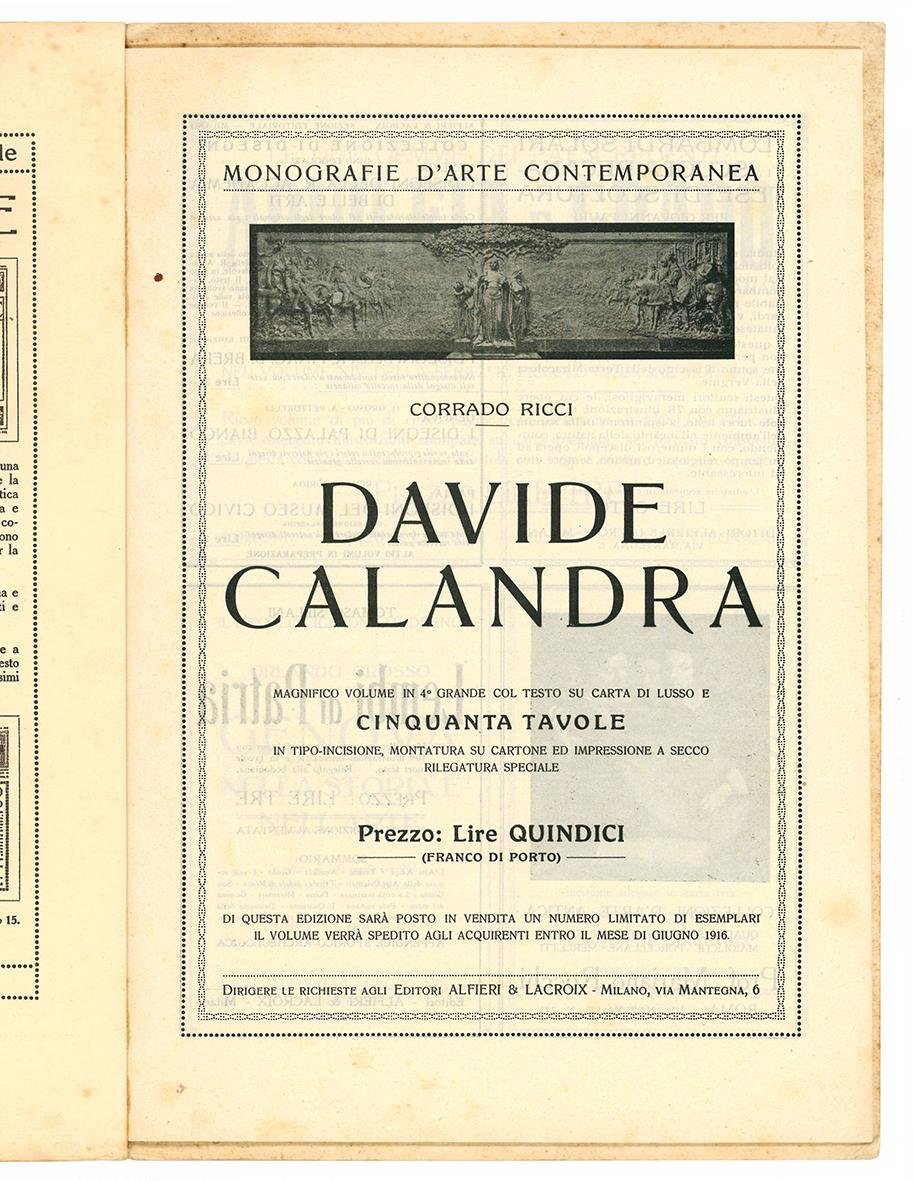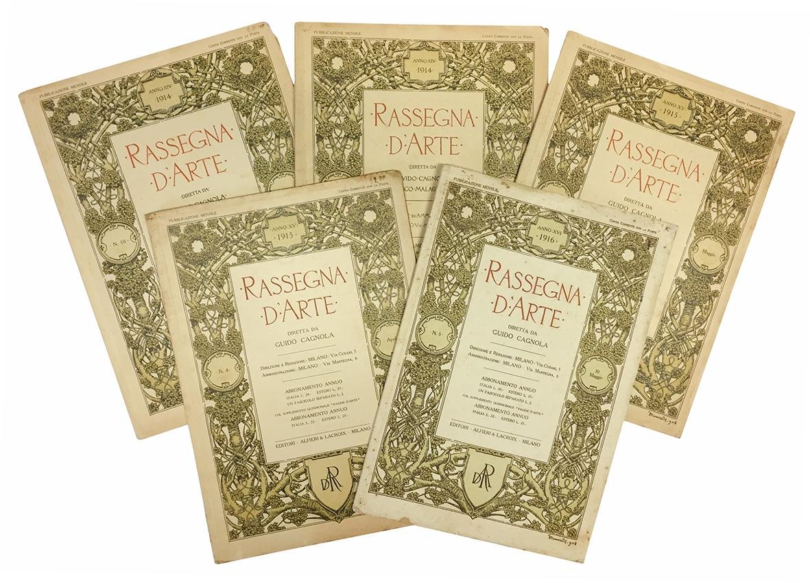 Lotto di cinque numeri del mensile "Rassegna d'Arte". In 4to (mm 294x201). Illustrazioni in bianco e nero nel testo e fuori testo. Carta leggermente ed uniformemente brunita, piccoli strappi al margine di alcune carte che tuttavia non interessano il testo. Belle brossure editoriali illustrate a colori, quelle anteriori sottoscritte Montalti - 908. Copertine un po' sporche e con minime mancanze marginali.