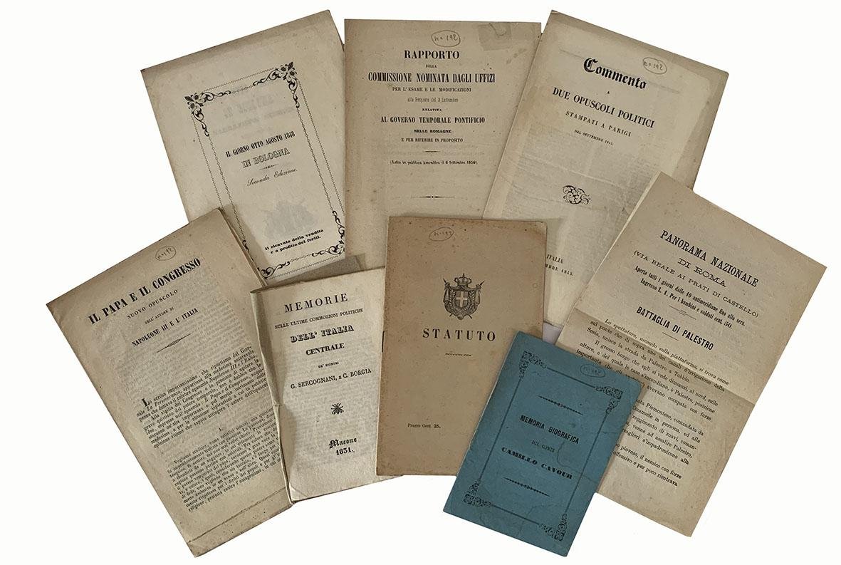 - Rapporto della commissione nominata dagli uffizi per l'esame e le modificazioni alla proposta del 3 settembre relativa al governo temporale pontificio nelle romagne e per riferire in proposito. Tipi governativi della Volpe e del Sassi, Bologna 1859. (mm 204x145); pp. 16. Finalini xilografico. Fogli in parte ancora chiusi. Lievissime fioriture. Piccolo strappo al margine superiore della prima carta.