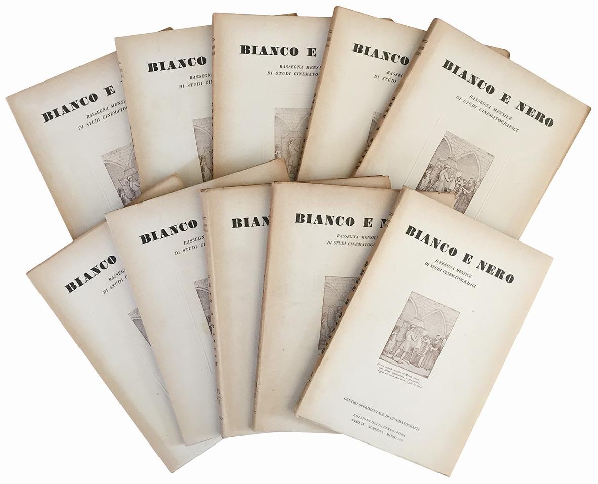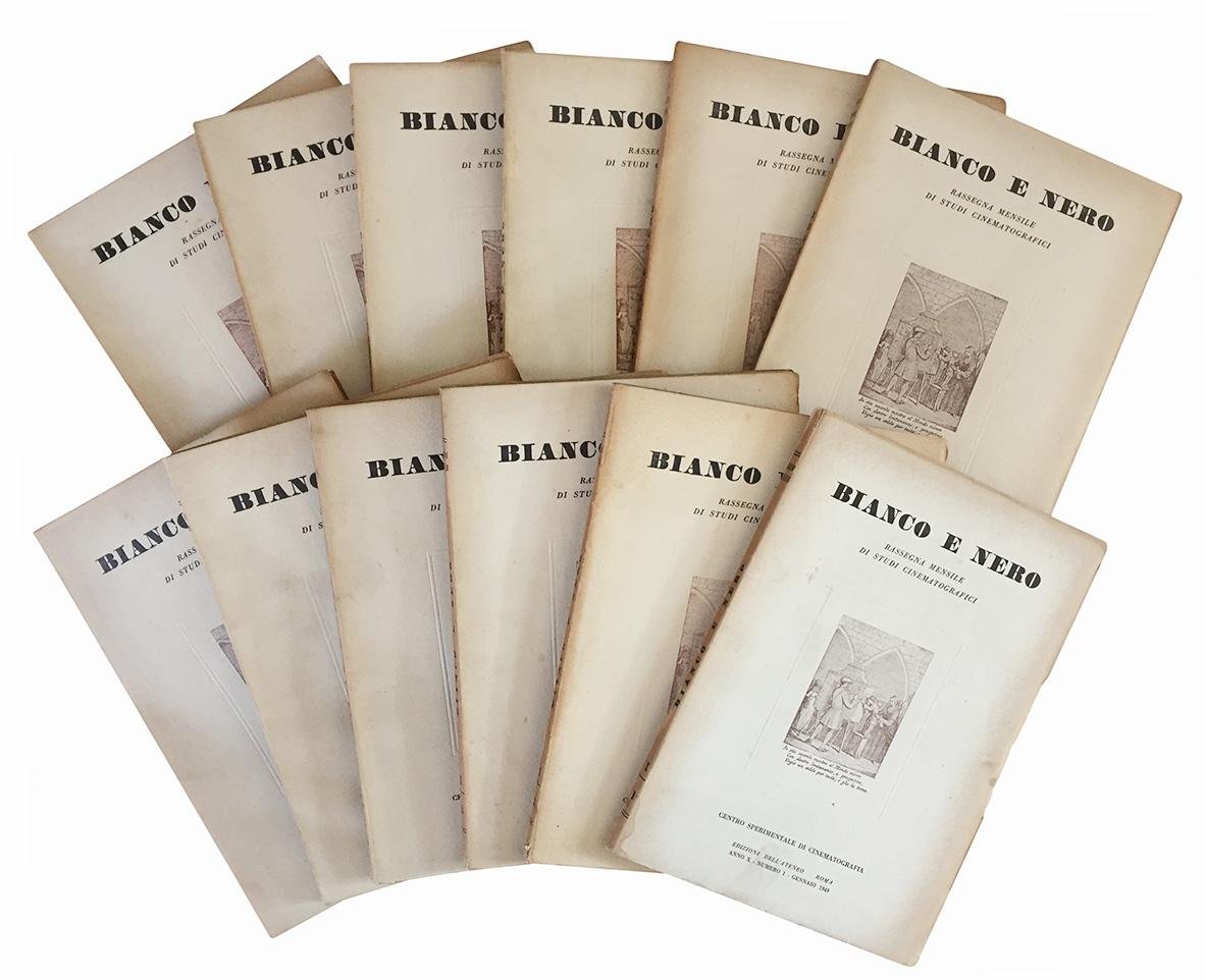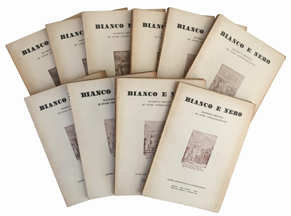 Lotto di tre annate complete del periodico "Bianco e Nero. Rassegna mensile di studi cinematografici". 34 numeri in 32 volumi in 8vo (mm 250x175). Illustrazioni in bianco e nero nel testo e fuori testo. Carta leggermente ed uniformemente brunita, piccoli strappi al margine di alcune carte che tuttavia non interessano il testo. Brossura editoriale illustrata. Lievi aloni e minime mancanze marginali alla copertine.