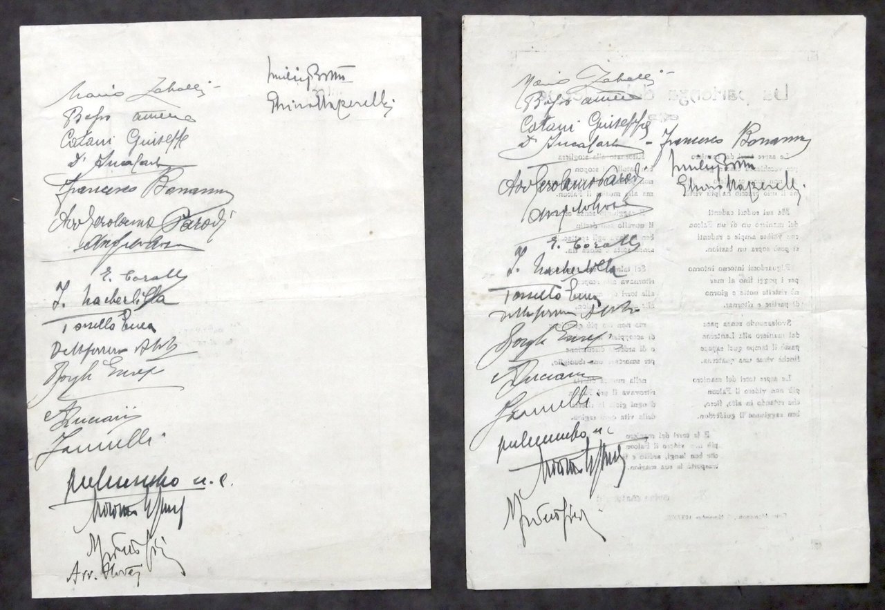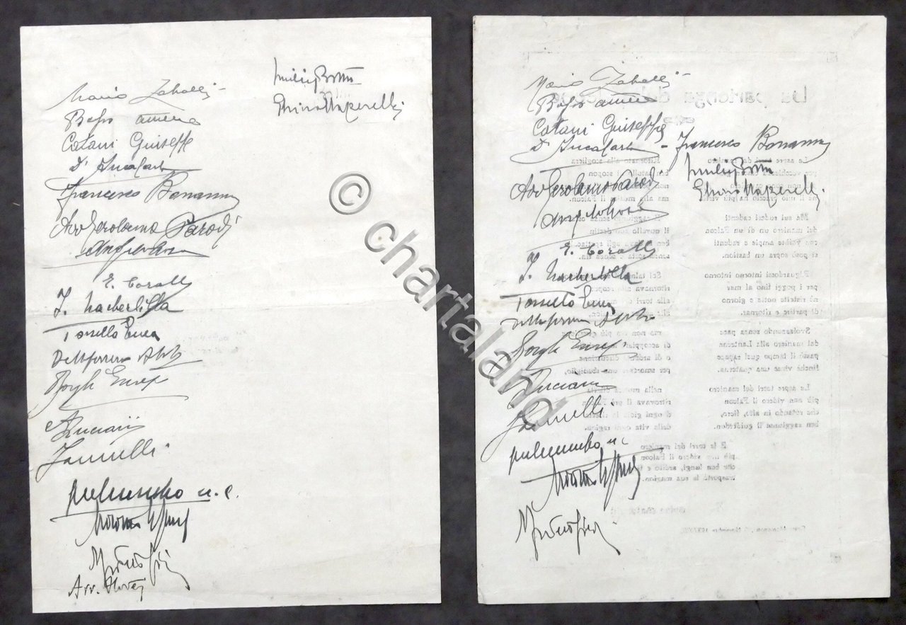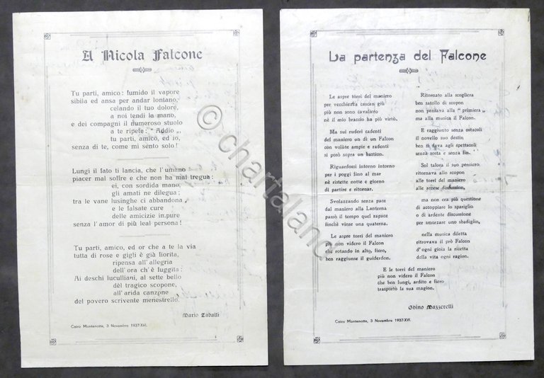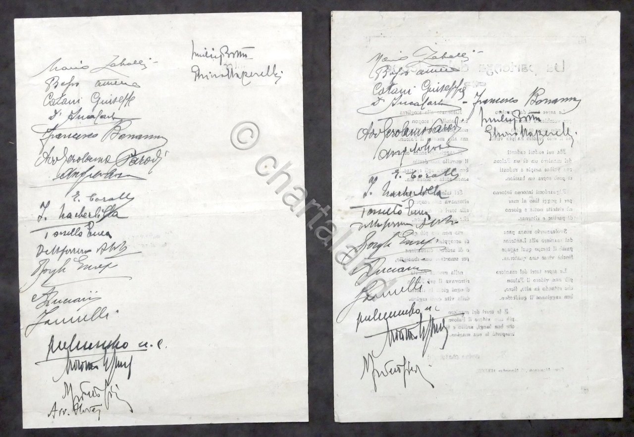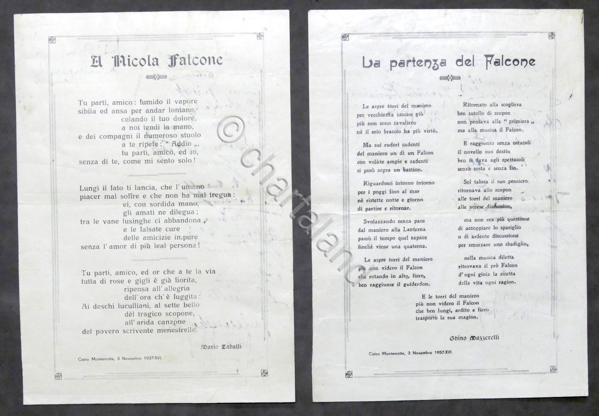 Sonetti commemorazione Nicola Falcone - Cairo Montenotte - 3 novembre 1937 con numerose firme dei partecipanti tra cui quelle degli autori. 2 fogli, dimensioni: 17 x 25 cm ca. Lingua italiana. Condizioni molto buone. Numerose firme sul retro.