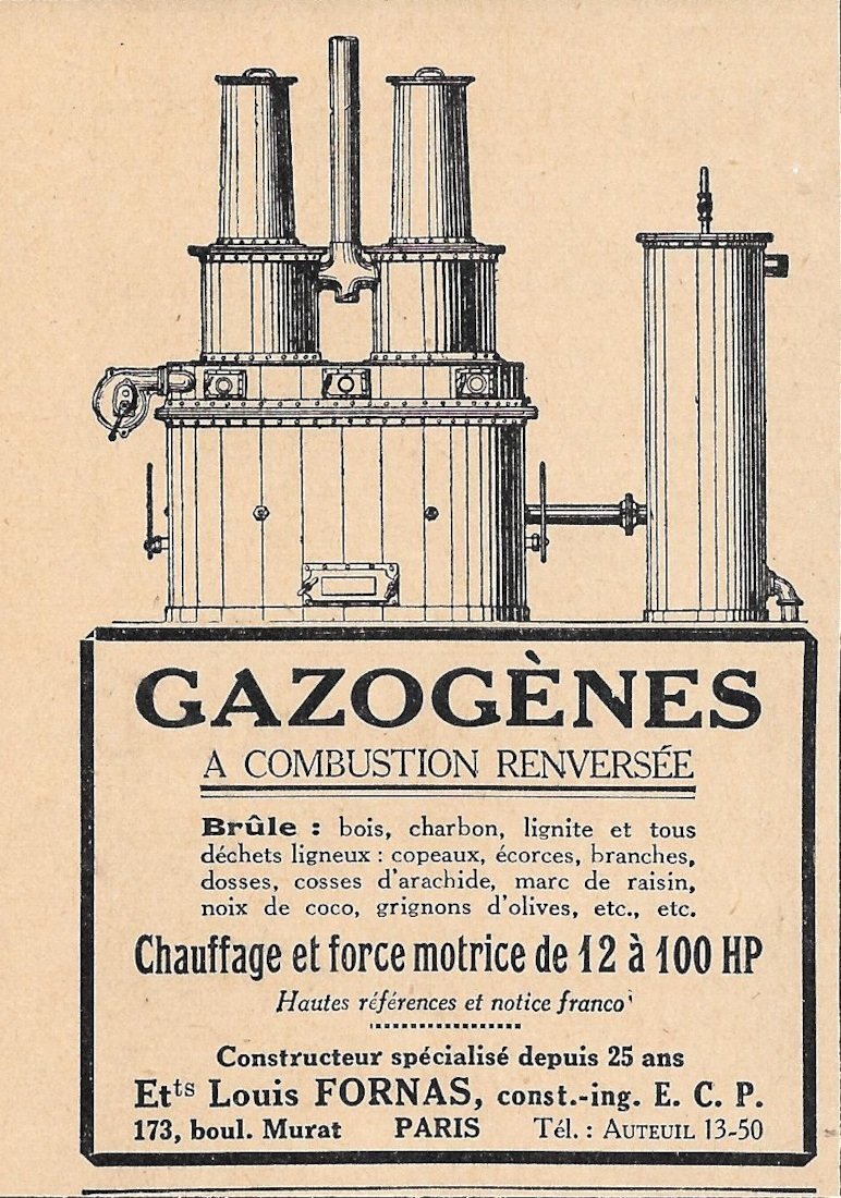 Louis Fornas. Gazogènes a combustion renversée - Advertising 1928