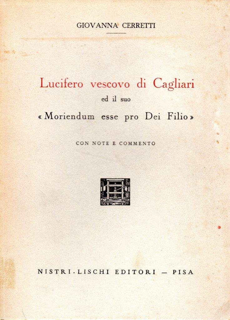 Lucifero vescovo di Cagliari ed il suo "Moriendum esse pro Dei Filio", prima edizione novembre 1940, pp. 155, formato 15,5 x 21,5.<BR>Copertina morbida di colore grigio con titoli in nero e rosso al piatto anteriore e in nero sul dorso. Volume intonso. <BR>Leggere fioriture al piatto anteriore. Nel complesso ottime condizioni.