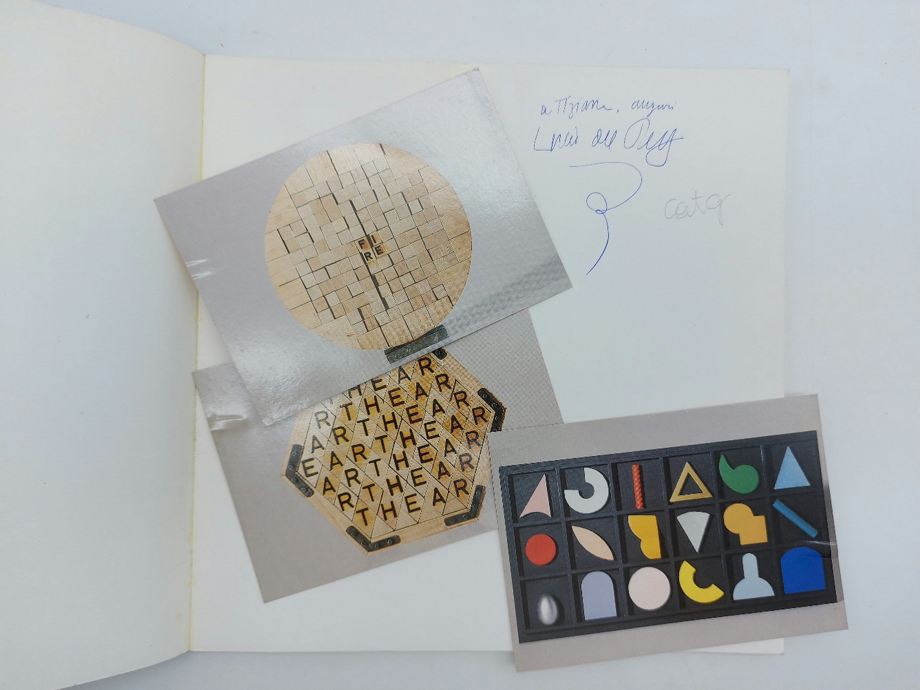 In 8 (cm 27 x 26), pp. 69 + (3) con riproduzioni fotografiche a colori di opere. Dedica autografia di Lucio Del Pezzo al primo foglio bianco. Catalogo della mostra di opere di Lucio Del Pezzo svoltasi presso il salone filiale Renault nel 1988.