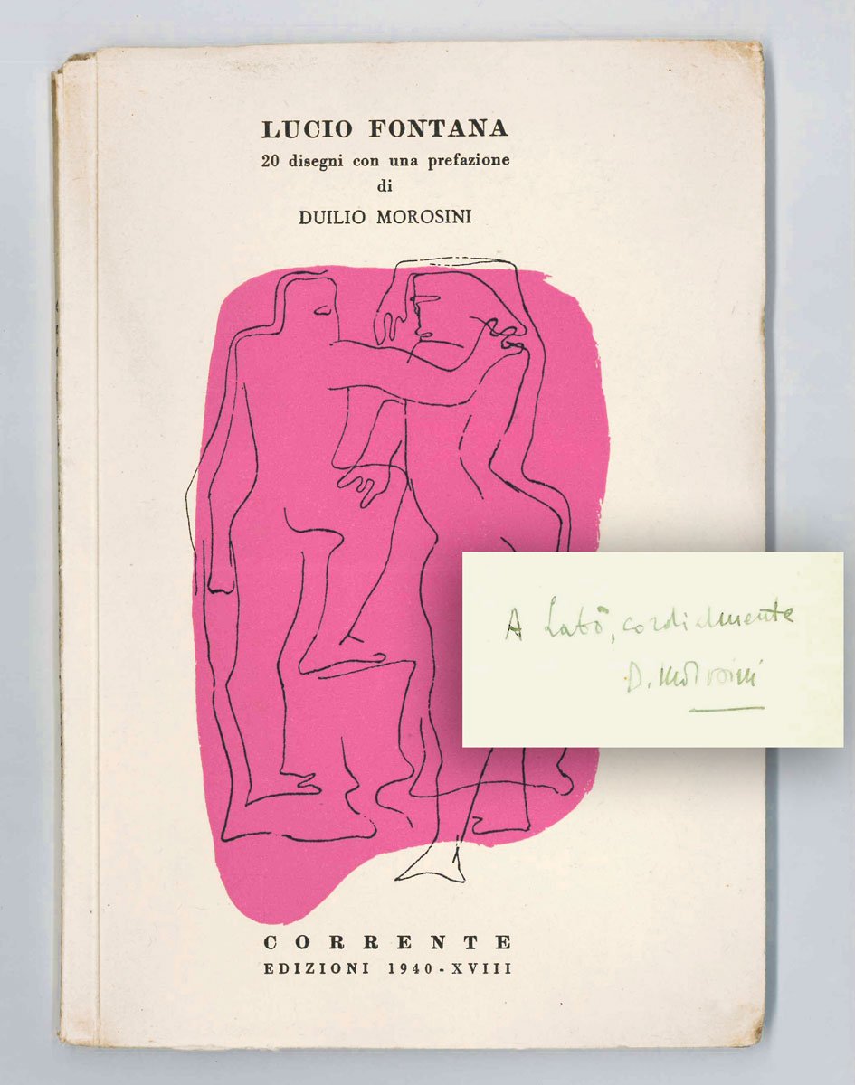 LIBRO Edizione originale. CON AUTOGRAFO. Esemplare pregiato dall’invio autografo del curatore, Duilio Morosini, vergato in inchiostro verde «A [Giorgio] Labò, cordialmente | D. Morosini». L’architetto e critico d’arte Giorgio Labò fu un protagonista della cultura italiana tra le due guerre, membro del MIAR e parte del cenacolo modernista maturato nella Milano di Persico, Domus e appunto «Corrente». Esemplare insoltitamente fresco e pulito sia internamente che alla copertina e, seppur non privo di piccoli normali segni del tempo, in complessive ottime condizioni. Primo libro delle edizioni della celebre rivista diretta da Enrico Treccani, voce della critica d’arte italiana più avanzata nei tardi anni trenta. «L’Avvertenza di Morosini in apertura della monografia è un’introduzione, più che alla lettura di Fontana, alla lettura che Persico aveva dato e di Fontana e dello stato dell’arte italiana di quegli anni. E a Persico è anche di fatto dedicato il libro di “Corrente” che reca in epigrafe il [.] passo conclusivo del breve saggio scritto da Edoardo Persico per un altra monografia dedica a Lucio Fontana e pubblicata dalle edizioni della rivista “Campo grafico” nel 1936» (Sebastiani, p. 14). Sebastiani, I libri di Corrente, pp. 13-17, 59 (n. 1), 131 (illustrazione)