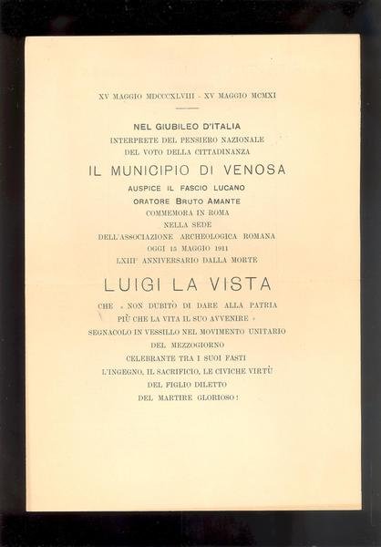 FASCICOLO IN 8 gr. ( cm.27 X 19 ), QUATTRO FACCIATE. IL FASCICOLO, E' COSI' COMPOSTO : <BR>pg.1, XV MAGGIO MDCCCXLVIII - XV MAGGIO MCMXI. NEL GIUBILEO D'ITALIA INTERPRETE DEL PENSIERO NAZIONALE DEL VOTO DELLA CITTADINANZA IL MUNICIPIO DIVENOSA AUSPICE IL FASCIO LUCANO ORATORE BRUNO AMANTE COMMEMORA IN ROMA NELLA SEDE DELL'ASSOCIAZIONE ARCHEOLOGICA ROMANA OGGI 15 MAGGIO 1911, LXIII ANNIVERSARIO DELLA MORTE LUIGI LA VISTA, ECC. pg.2, RITRATTO DI LUIGI LA VISTA ( 1826 - 1848 ). pg.3, FAC - SIMILE DI UNA LETTERA DI L. LA VISTA SCRITTA AGLI ZII NEL 1843. pg.4. SEGNO TIPOGRAFICO AL CENTRO E LOGO DELLO STAMPATORE. LUIGI LA VISTA DA VENOSA ( PZ.),<BR>29-1-1826, MORTO A NAPOLI IL 15-5-1848. SCRITTORE E PATRIOTA ITALIANO, MARTIRE DELL'INSURREZIONE NAPOLETANA DEL 1848. FU ALLIEVO DI FRANCESCO DE SANCTIS. FU GUARDIA NAZIONALE NEL 1848 E PRESE PARTE A NAPOLI AL COMBATTIMENTO DEL 15 MAGGIO.ARRESTATO, FU FUCILATO SENZA PROCESSO DAGLI SVIZZERI.OTTIMA CONSERVAZIONE, RARO FASCICOLO SUL RISORGIMENTO NAPOLETANO. ID 4480<BR>