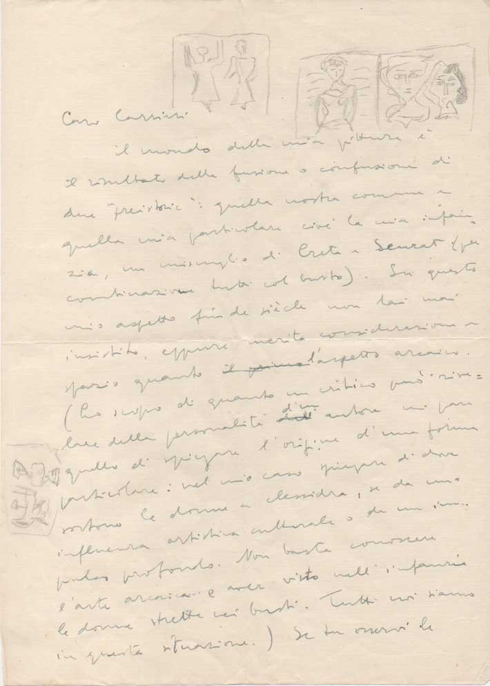 AUTOGRAFOInteressante missiva nella quale Campigli descrive il "mondo della sua pittura": "è il risultato della fusione o confusione di due "preistorici": quella nostra comune e quella mia particolare cioè la mia infanzia, un miscuglio di Creta e Seurat [Georges] […]. Su questo mio aspetto fin de siècle non hai mai insistito, eppure merita considerazione e spazio. […] Nel mio caso spiegare da dove sorgono (?) le donne a clessidra, se da una influenza artistica culturale o da un impulso profondo. Non basta conoscere l'arte arcaica e aver visto nell'infanzia le donne strette nei busti. Se tu osservi […] gli atteggiamenti delle mie donnine per le quali lo star sedute o tenere qualcosa in mano o sorridere è lo scopo di una vita, non solo ti apparirà l'idolo antico ma anche la nostra prossima parente, la donna della passata generazione, e nella mia ostinazione a risolvere il problema della rappresentazione della donna con un geroglifico ti apparirà la mentalità del bambino un po' speciale che io fui. […] Fin oltre 10 anni credetti che la sola differenza indelebile tra l'uomo e la donna consisteva nelle orecchie forate o no. [… Avevo sotto gli occhi donne vestitissime dai contorni artificiali […] si misuravano il vitino e nei discorsi deformavano tutto secondo le formule di una civiltà sbagliata […]. La povertà della mia tavolozza è voluta. Bianco e nero terre rosse e gialle e brune e un po' di terra verde marrone e di blu cobalto […]. Io credo ormai che il quadro agisca sullo spettatore da una parte, sì, coi suoi elementi decorativi, ma dall'altra in modo non meno necessario attraverso un "non so che" di tenuissimo dove il subcosciente dell'autore parla al subcosciente dello spettatore […]".