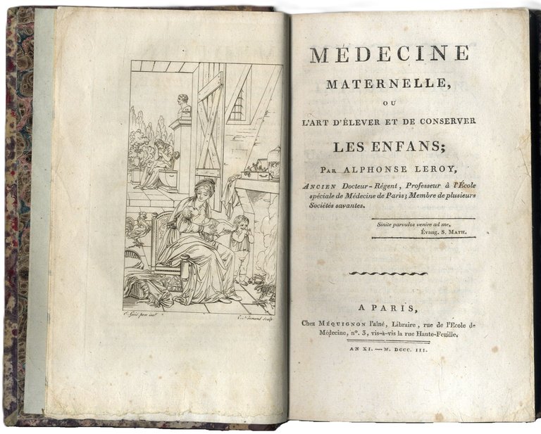 >in-8, pp. XXIV, 442, (2), legatura del tempo mezza pelle con titolo in oro e fregi a secco, tagli marmorizz. Con un antiporta inc. in rame al tratto. Prima edizione di questo ampio ed approfondito trattato medico-pediatrico che si occupa di ogni aspetto inerente la nascita dei bambini, la loro nutrizione e crescita, le malattie, ecc. Alphonse-Louis-Vincent Leroy, nato a Rouen nel 1742 e morto nel 1816, fu illustre medico e prolifico pubblicista. Ottimo esemplare. Wellcome III, 496. Bibl. Walleriana I, 5734. Leclerc, Biogr. médicale II, 667.