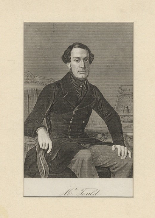 M.r Fould. (Ritratto a mezza figura, rivolto di 3/4 verso destra: seduto in poltrona col braccio destro appoggiato sul bracciolo e la mano sinistra sul ginocchio corrispondente; sullo sfondo uno scrittoio con calamaio).