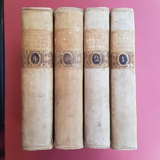 4 voll. in-8°, pp. XXXII, 600; (4), 686; (4), 706; (4), 775, legature in piena pergamena rigida coeva, titolo e numerazione su tassello in oro al dorso. Bellissima copia nella splendida legatura in piena pergamena dell'epoca, lievi bruniture. Ottimo stato di conservazione.