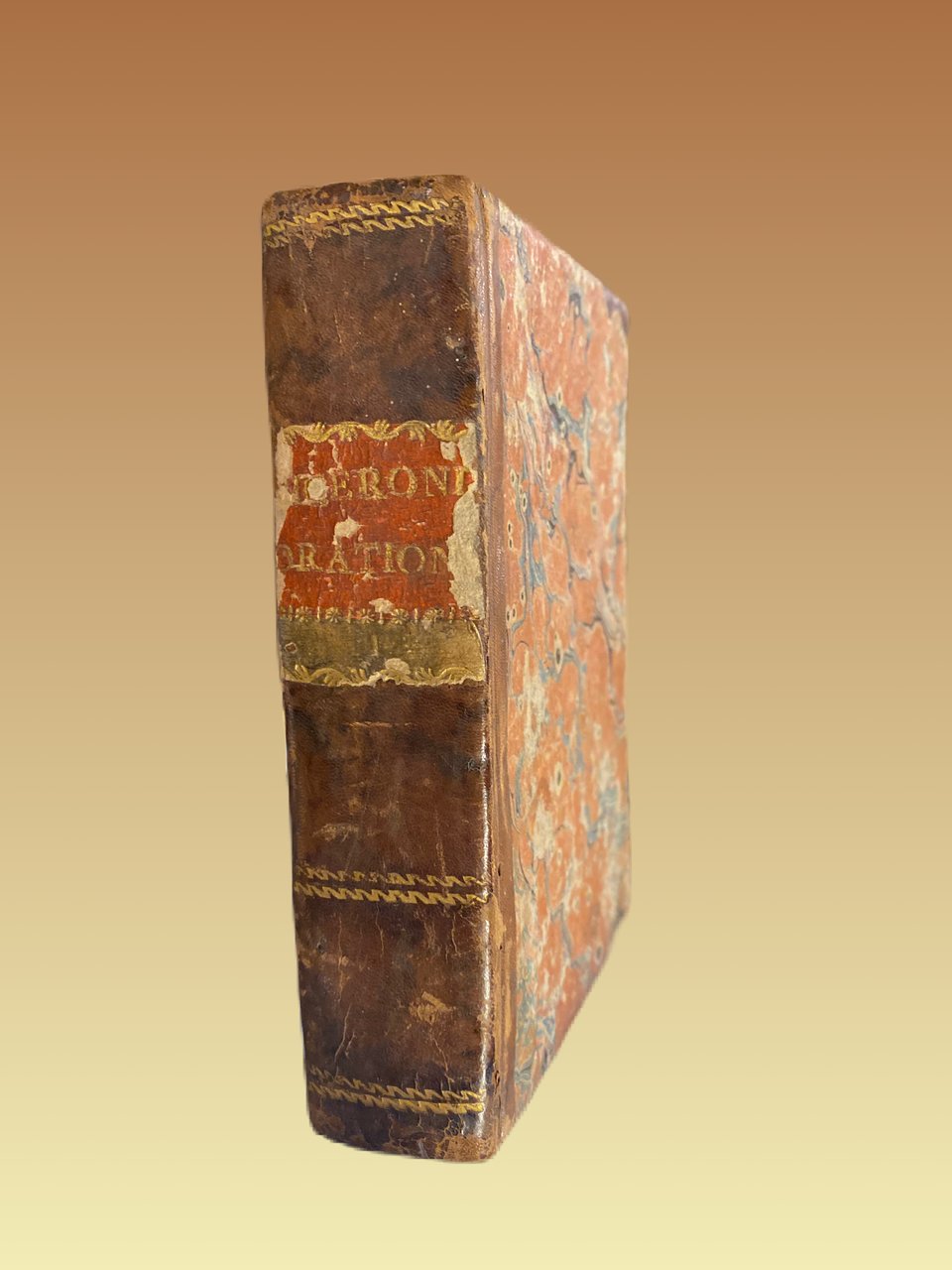 Vol. unico, in -16, (misura pagina mm. 15,3x9,8), frontespizio screpolato con parti manoscritte e timbro ex libris, cc. 4 n.n., 303, 1 n.n., al temine parti manoscritte, le carte sono numerate sul recto, segni d'uso a penna bruna molto antichi, rifilati insieme alle pagine successivamente, legatura mezza pelle con piatti marmoriz, ottocentesca, tassello rosso con titolo oro.qualche fioritura e su alcune pagine timbro ex libris che si ripete. Un angolo mancante alla pagina finale con marchio tipografico.